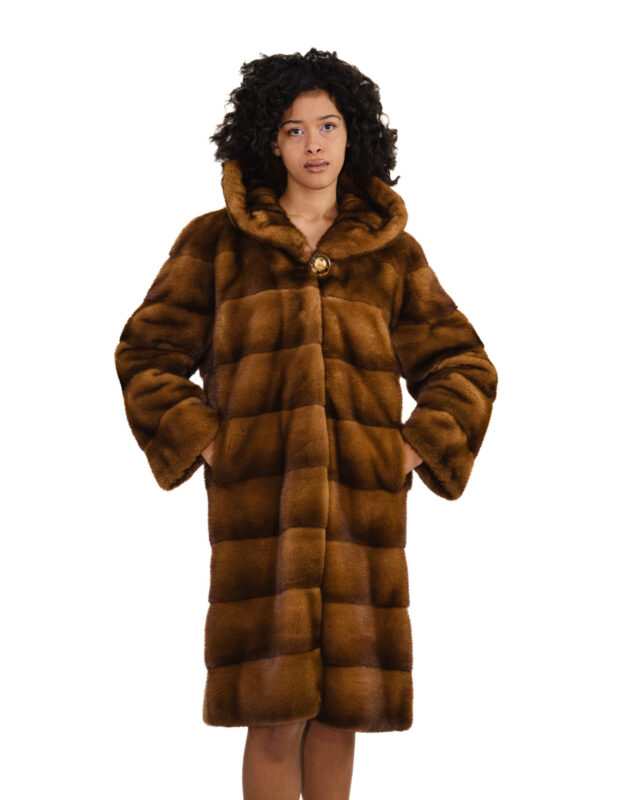 Cappotto orizzontale oro visone cappuccio 40 manica lunga lungo 82 centimetri tasche esterne chiusura ganci