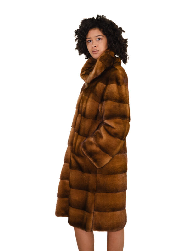 Cappotto a campana mogano 42 visone pelliccia verticale collo sciallato chiusura ganci manica lunga tasche esterne