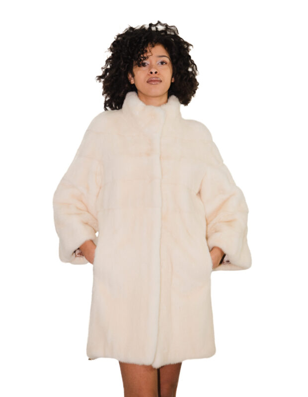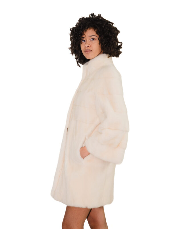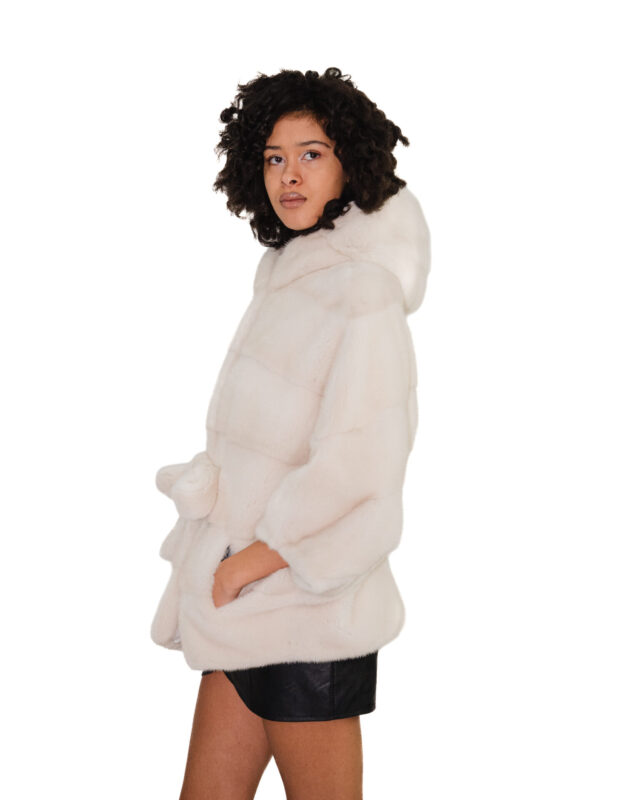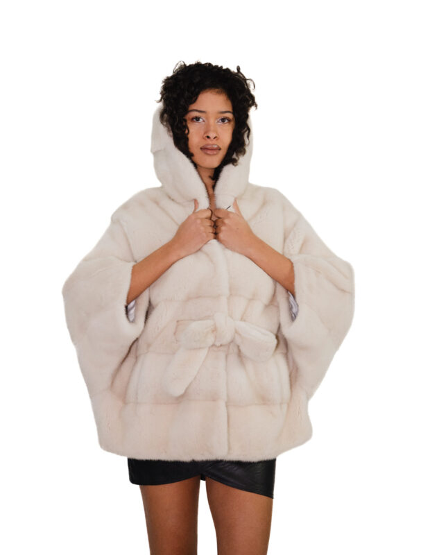 Mantella bianco visone 48/54 con lavorazione orizzontale a pelle intera con cappuccio e cintura in vita interna