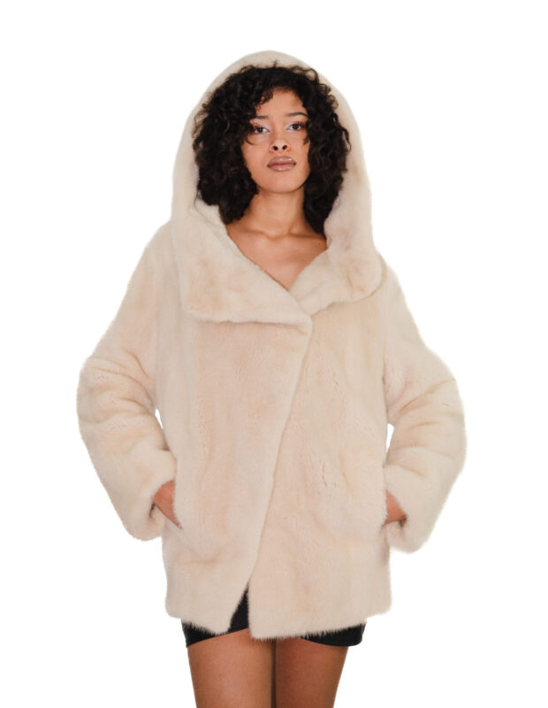 Giacca visone orizzontale cappuccio 46 marroncino chiaro manica lunga bottone al collo coulisse vita