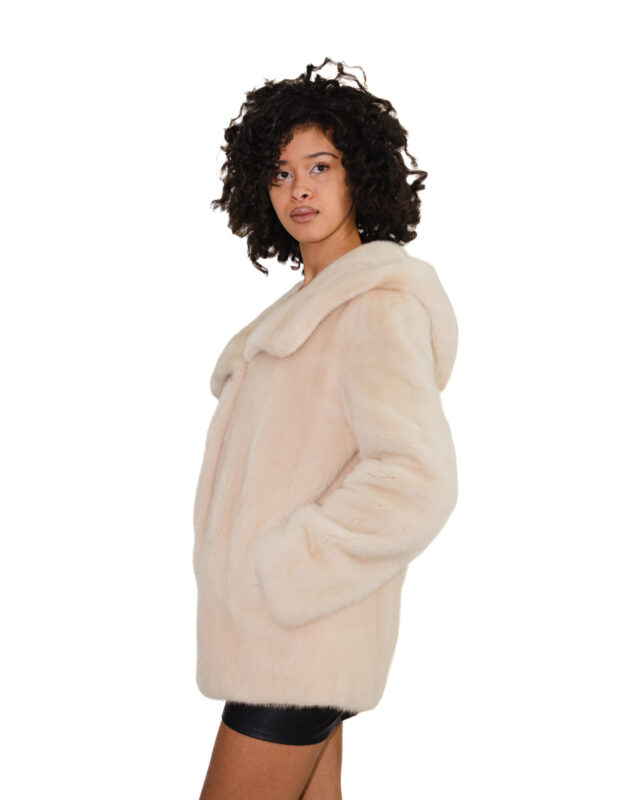 Giacca corta in visone demi 48 trasportato manica lunga e cappuccio foderato metà pelliccia metà fodera