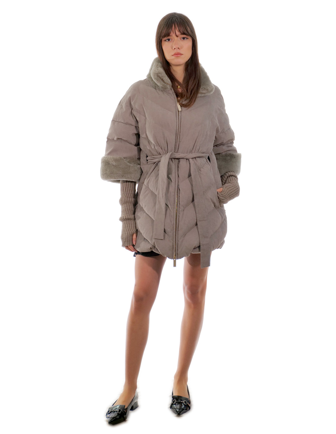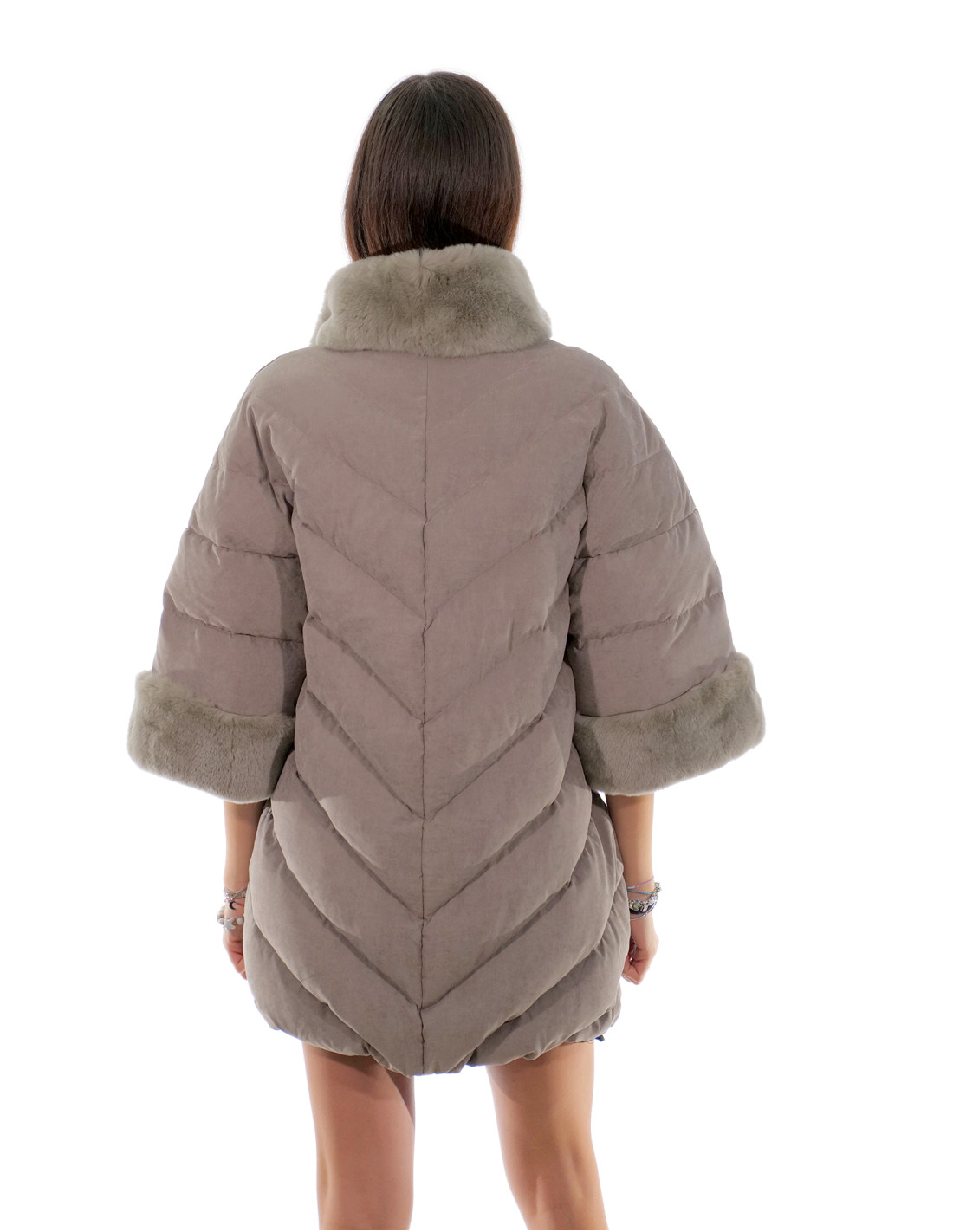 Cappotto piumino mezza manica grigio 52 con manicotti in lana in tessuto tecnico esterno pelliccia rex
