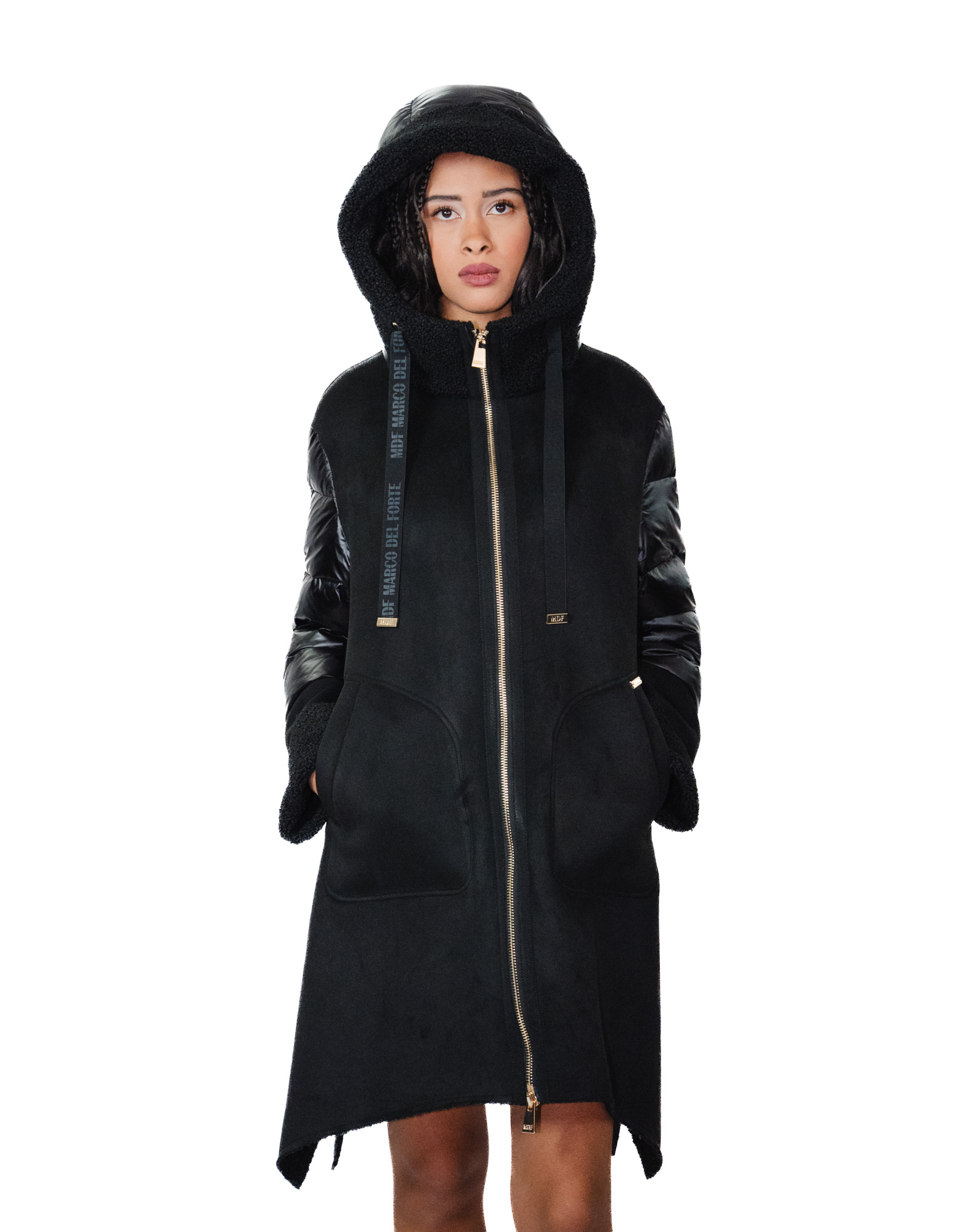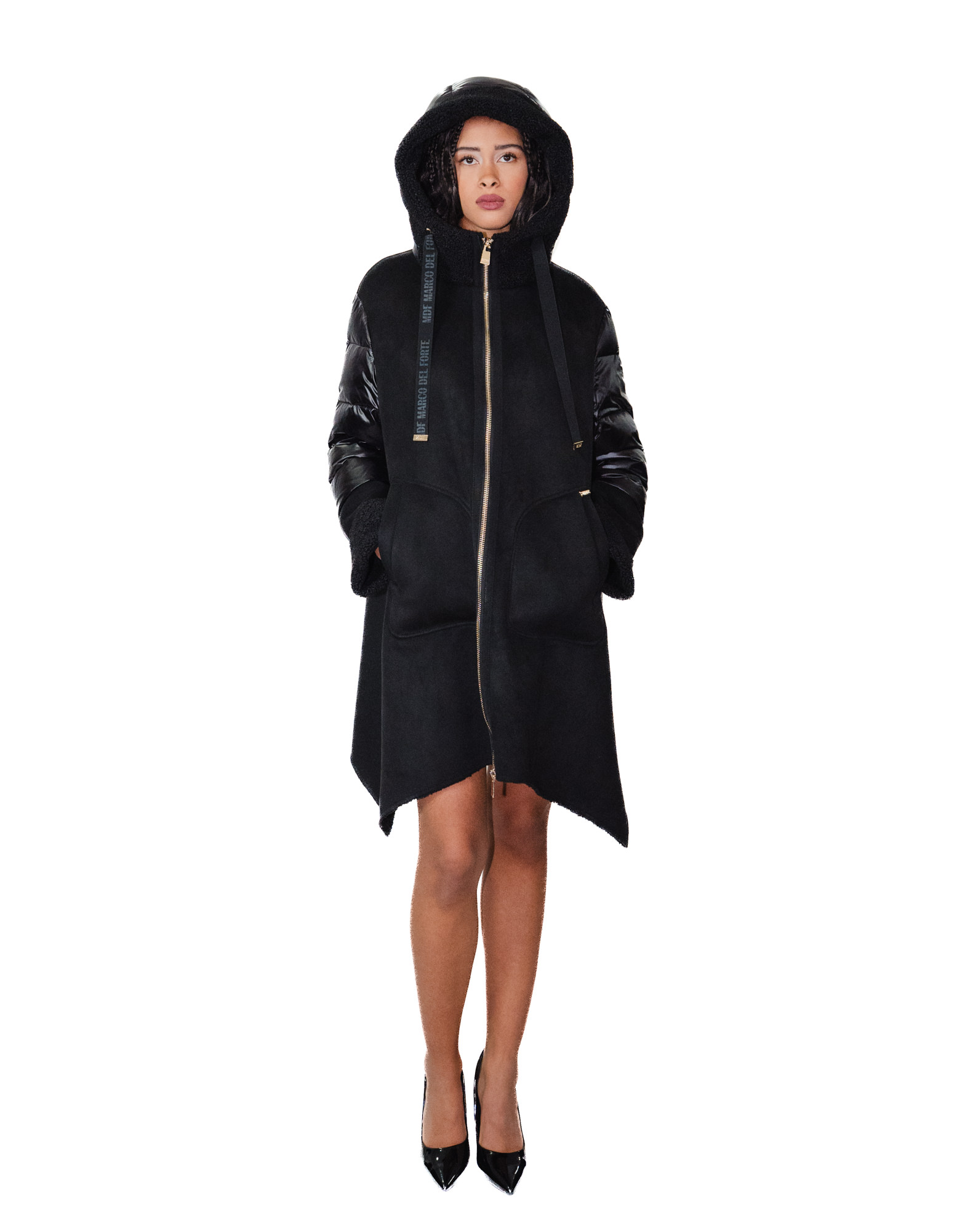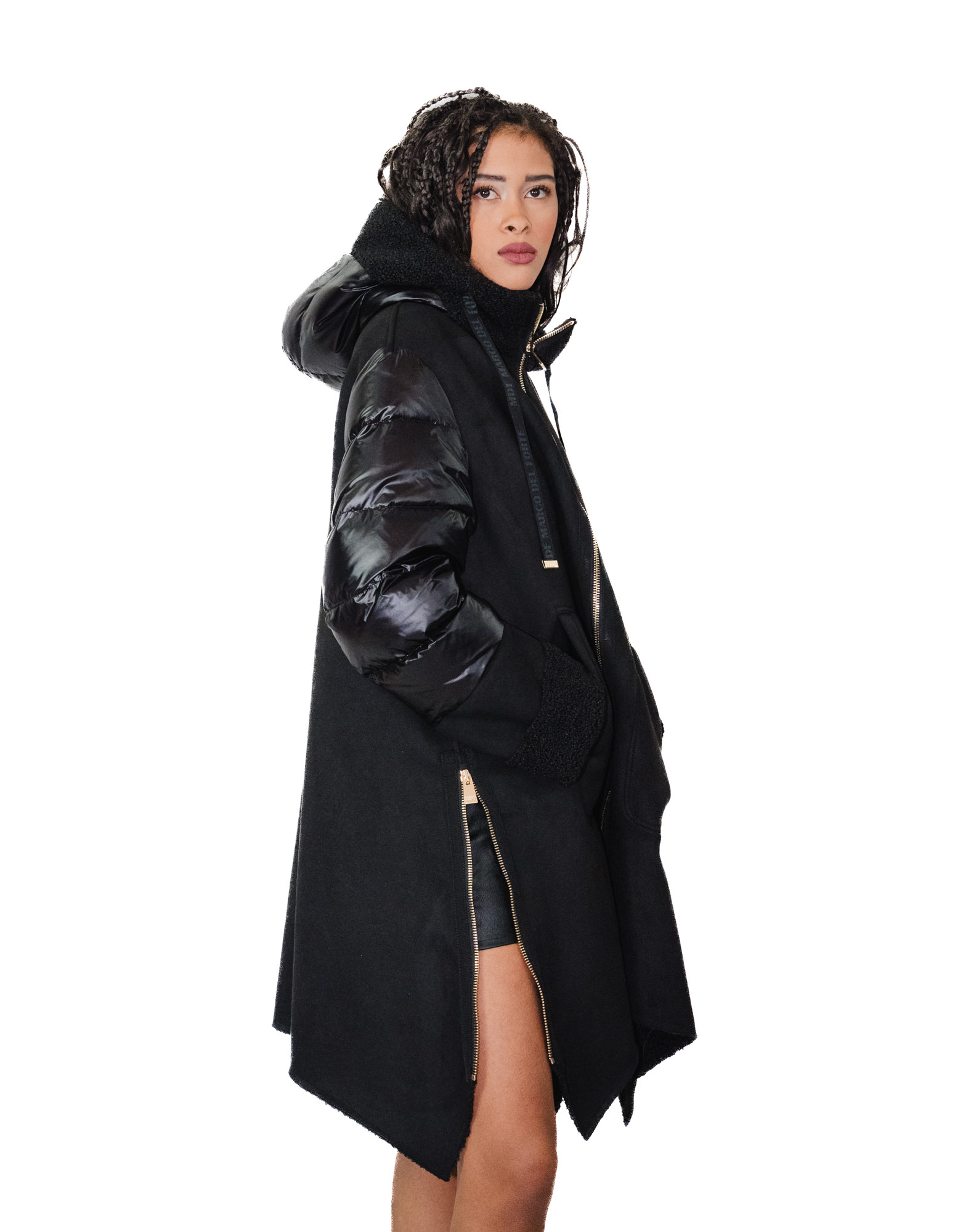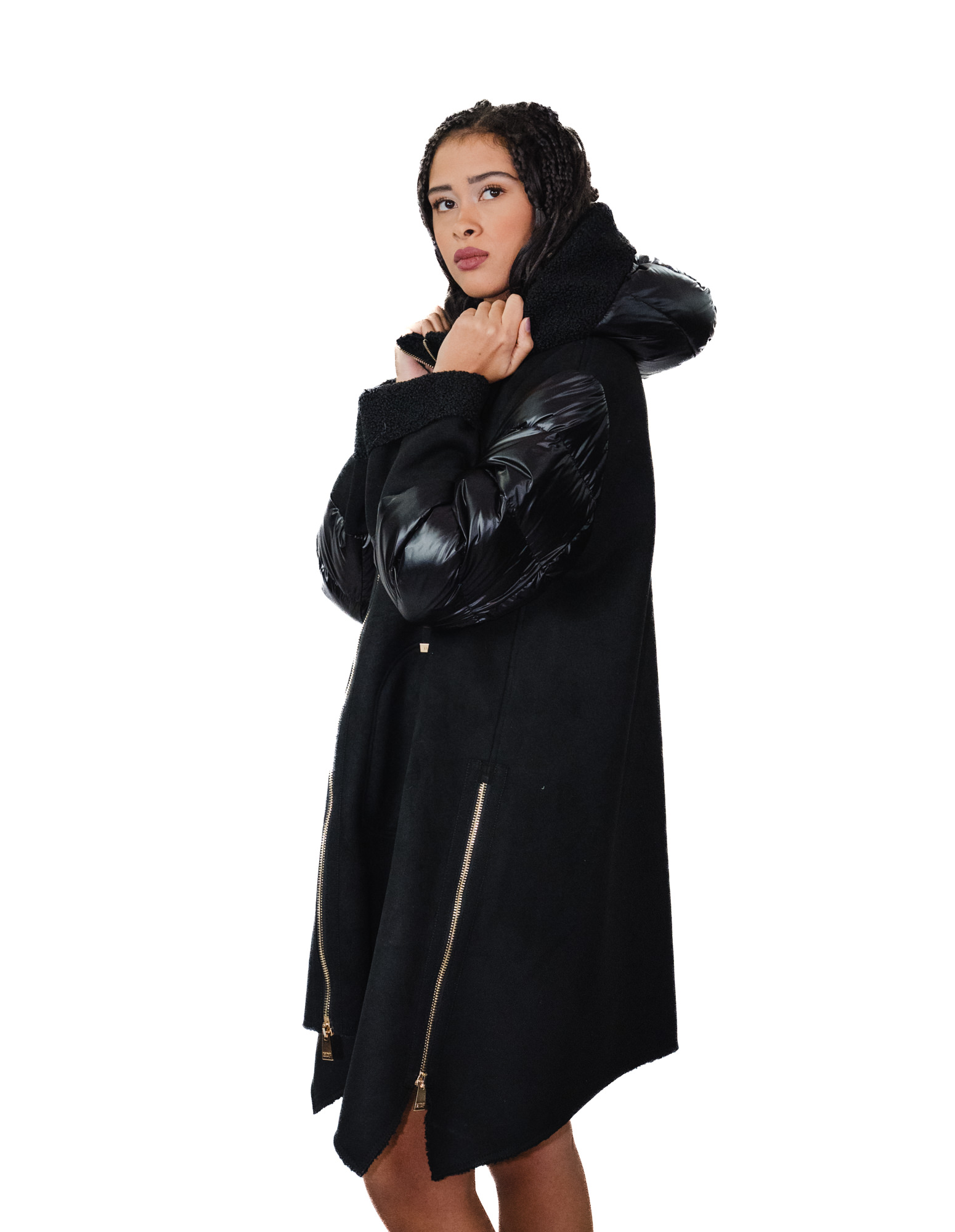 Daunenjacke und Öko-Lammfellcape, Modell 48, schwarze Kapuze, goldener Reißverschluss und seitliche Reißverschlüsse