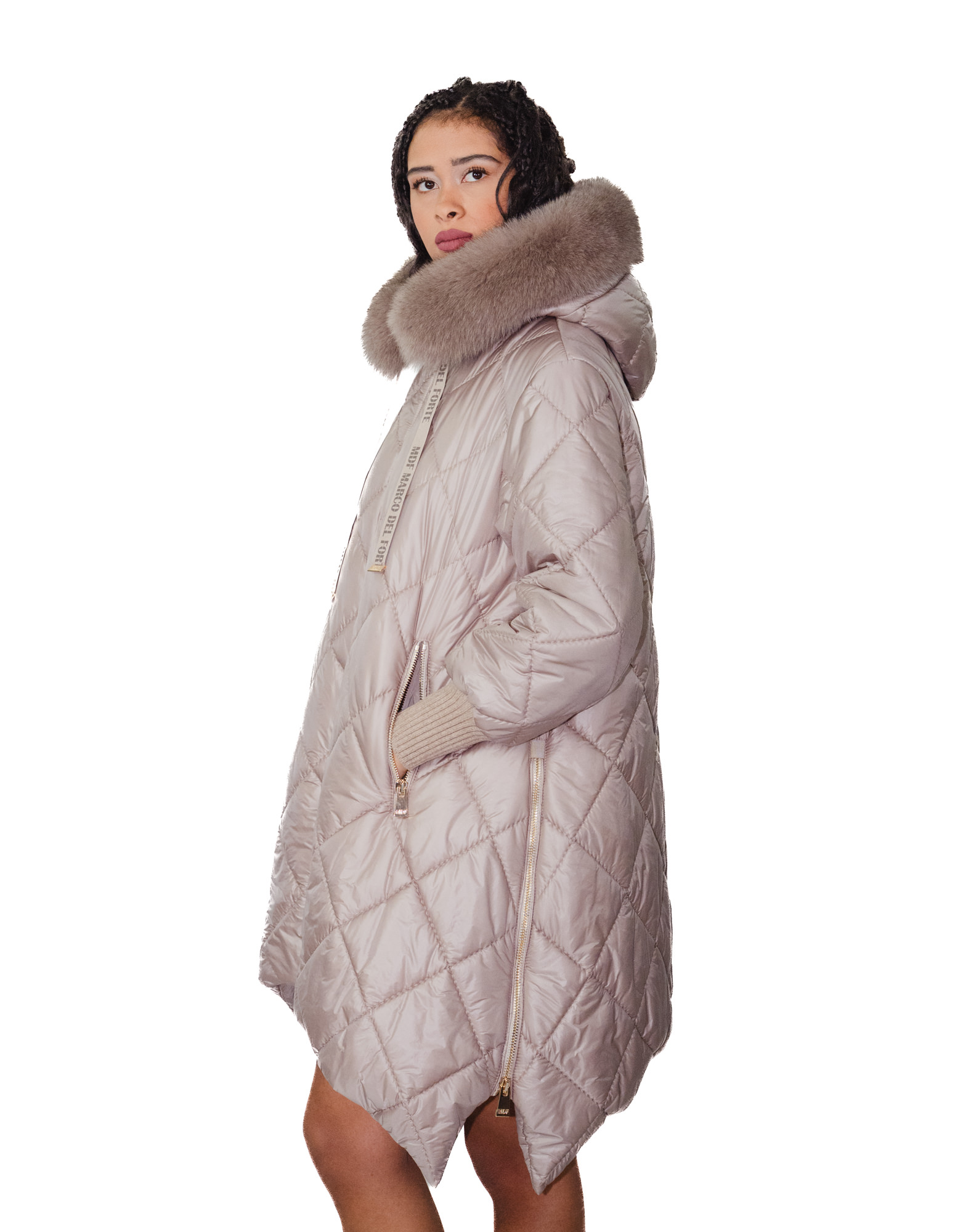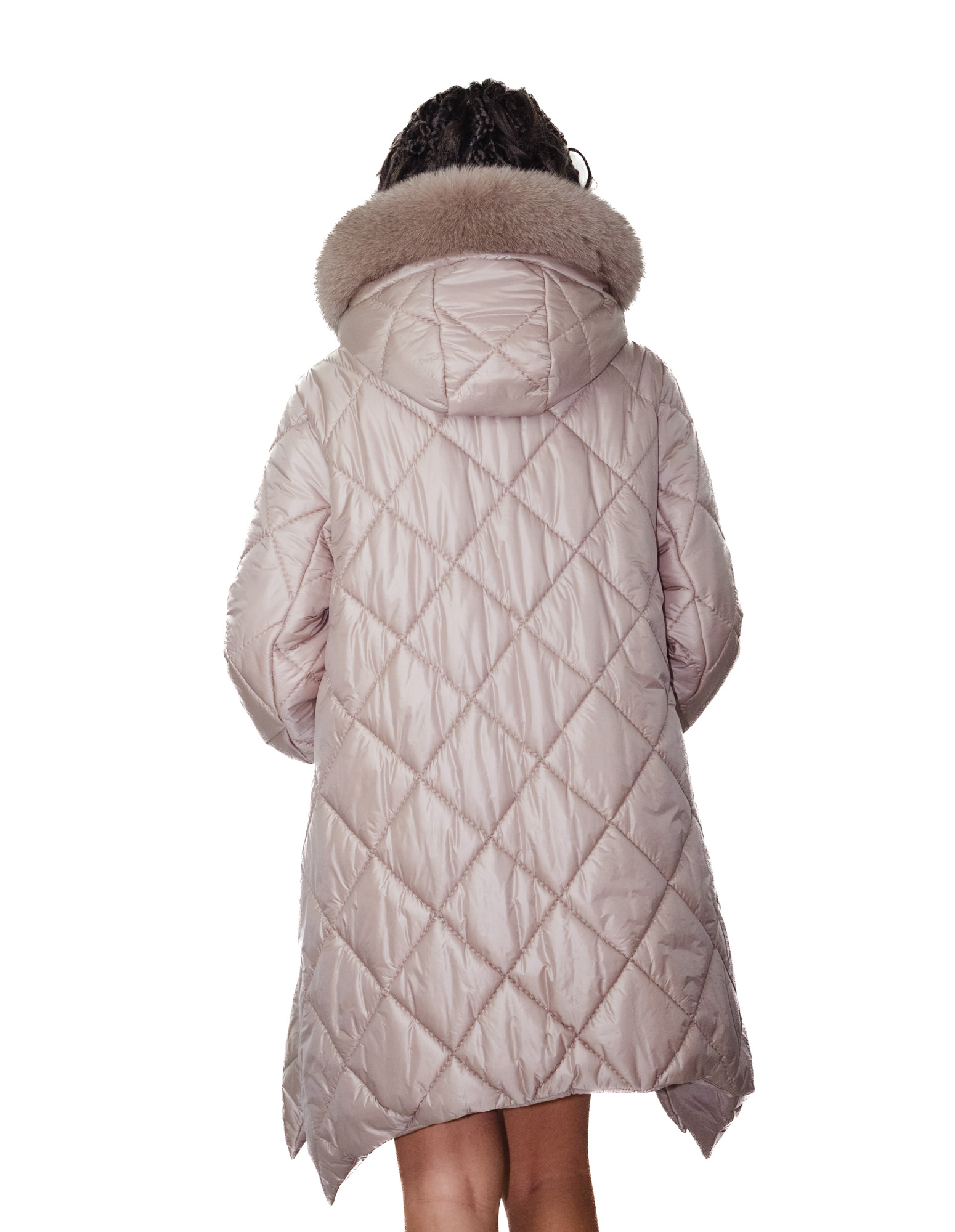 Taubengraue Daunenjacke mit Rautenmuster, Größe 48, mit ausgestelltem Saum, seitlichem Reißverschluss am Ärmelbündchen, Wollkapuze und Fuchspelzbesatz.
