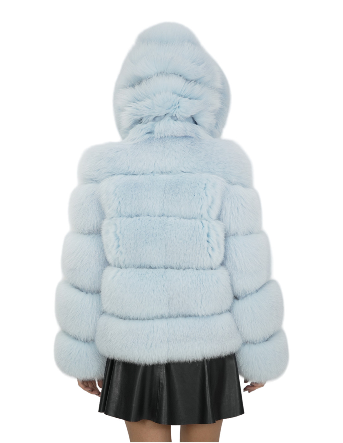 64 cm lange Jacke 42 hellblaues Fuchsfell horizontaler Strick mit langen Ärmeln und Kapuze
