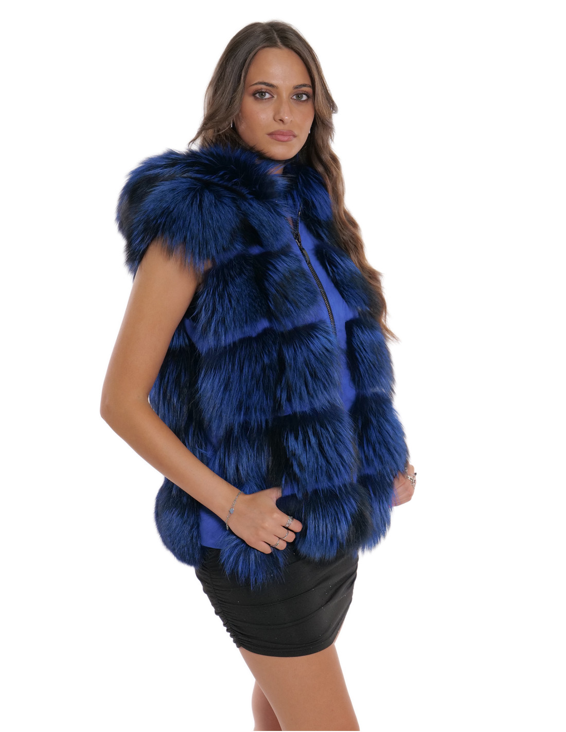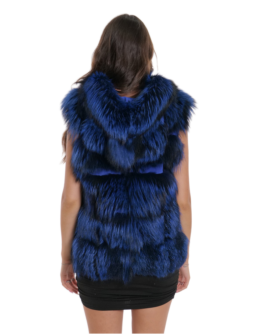 Fuchspelzweste mit ganzen Fellen in horizontaler Verarbeitung, 66 Zentimeter lang. Unsere Fuchspelze sind Produktionen, die in unseren Labors hergestellt werden, daher eine einzigartige und exklusive Fuchsjacke. Die Möglichkeit, unsere Pelze in höchster Qualität herzustellen, ermöglicht es uns, Angebote zu unterschiedlichen Preisen zu unterbreiten, wobei immer verschiedene Möglichkeiten zu niedrigen Preisen verfügbar sind. Darüber hinaus garantieren unsere Labore und unsere Kooperationen Fuchspelz von unbestrittener Qualität, 100 % hergestellt in Italien. Bei der hierfür verwendeten Fuchspelzqualität handelt es sich um eine Fuchspelzjacke mit Fellen der Marke Saga Furs. Die Fuchspelzjacke wird in horizontaler Verarbeitung mit Einsätzen aus echtem Leder, mit Außentaschen und einer dampfenden Fuchskapuze außen präsentiert, während sich innen und an den Seiten des Produkts echtes Wildleder in blauer Farbe befindet, alles in blauer Farbe.