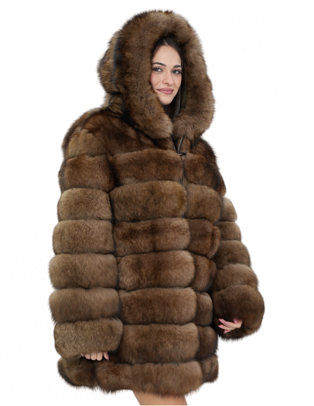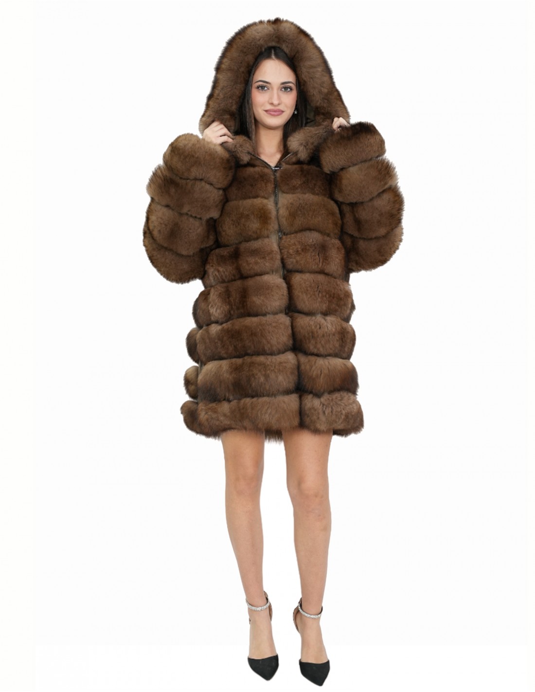 Fuchspelzmantel mit ganzen Fellen. Unsere Fuchspelze sind Produktionen, die in unseren Labors hergestellt werden, daher eine einzigartige und exklusive Fuchsjacke. Die Möglichkeit, unsere Pelze in höchster Qualität herzustellen, ermöglicht es uns, Angebote zu unterschiedlichen Preisen zu unterbreiten, wobei immer verschiedene Möglichkeiten zu niedrigen Preisen verfügbar sind. Darüber hinaus garantieren unsere Labore und unsere Kooperationen Fuchspelz von unbestrittener Qualität, 100 % hergestellt in Italien. Bei der hierfür verwendeten Fuchspelzqualität handelt es sich um eine Fuchspelzweste mit Nevepell-Signaturfellen. Der 80 Zentimeter lange Fuchspelzmantel mit echtem Ledereinsatz verfügt über Außentaschen, einen Reißverschluss und eine mit Futter und Außenpelz gefütterte Kapuze sowie Seitenschlitze mit Reißverschlüssen und ist alles in brauner Farbe gehalten.