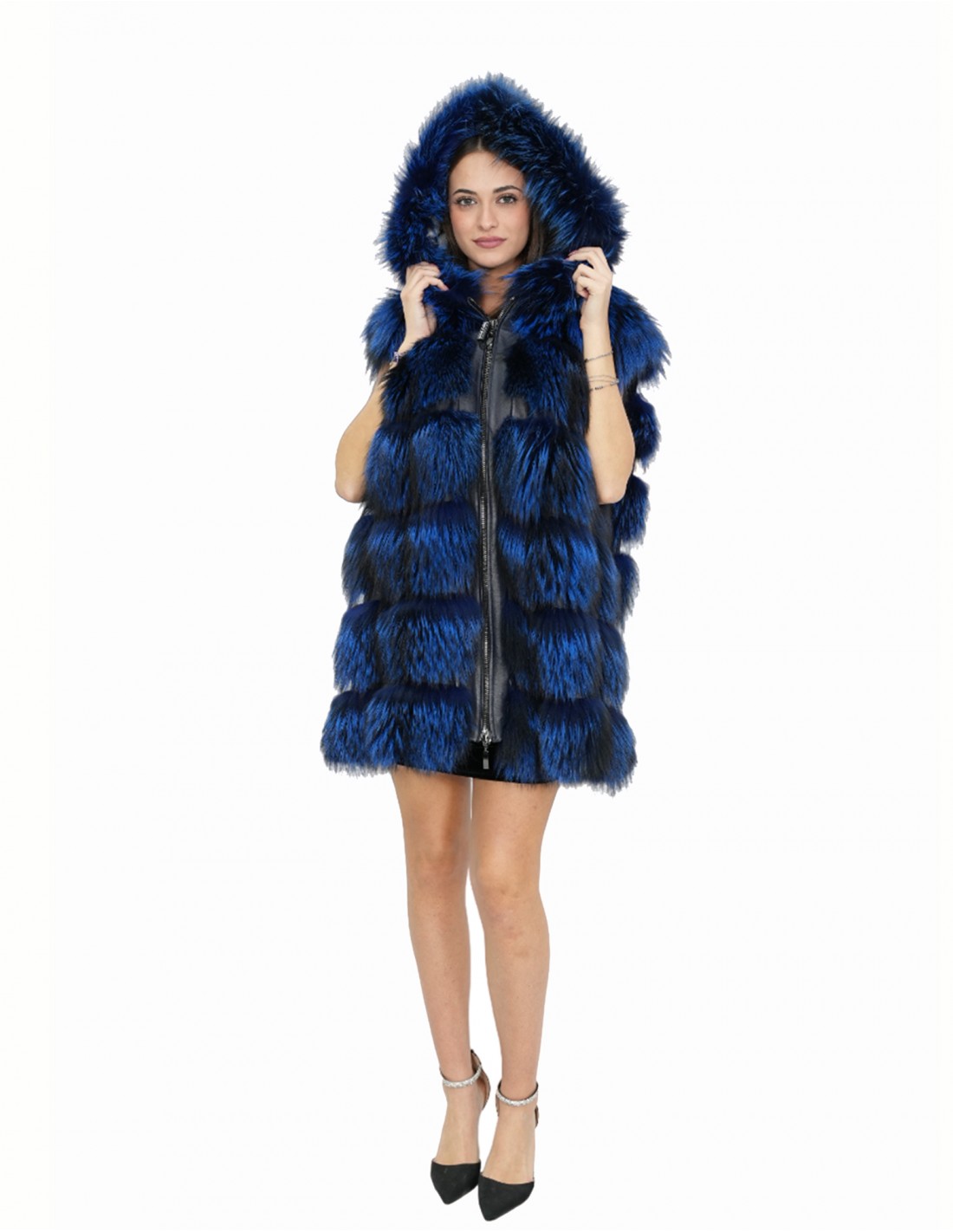 Fuchspelzweste mit ganzen Fellen in horizontaler Verarbeitung. Unsere Fuchspelze sind Produktionen, die in unseren Labors hergestellt werden, daher eine einzigartige und exklusive Fuchsjacke. Die Möglichkeit, unsere Pelze in höchster Qualität herzustellen, ermöglicht es uns, Angebote zu unterschiedlichen Preisen zu unterbreiten, wobei immer verschiedene Möglichkeiten zu niedrigen Preisen verfügbar sind. Darüber hinaus garantieren unsere Labore und unsere Kooperationen Fuchspelz von unbestrittener Qualität, 100 % hergestellt in Italien. Bei der hierfür verwendeten Fuchspelzqualität handelt es sich um eine Fuchspelzjacke mit Fellen von InModa Pellicceria. Die Fuchspelzjacke ist horizontal gefertigt mit Einsätzen aus echtem Leder, mit Außentaschen, einer Kapuze aus Fell außen und Futter innen, Reißverschluss, alles in elektrischem Blau.