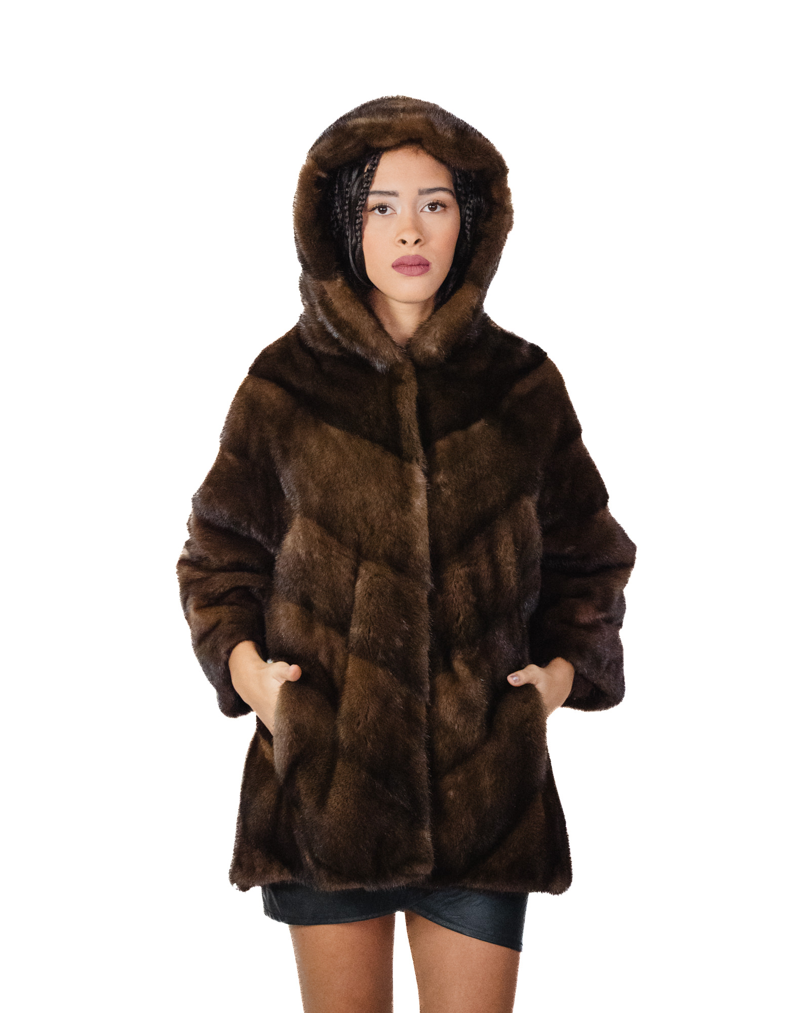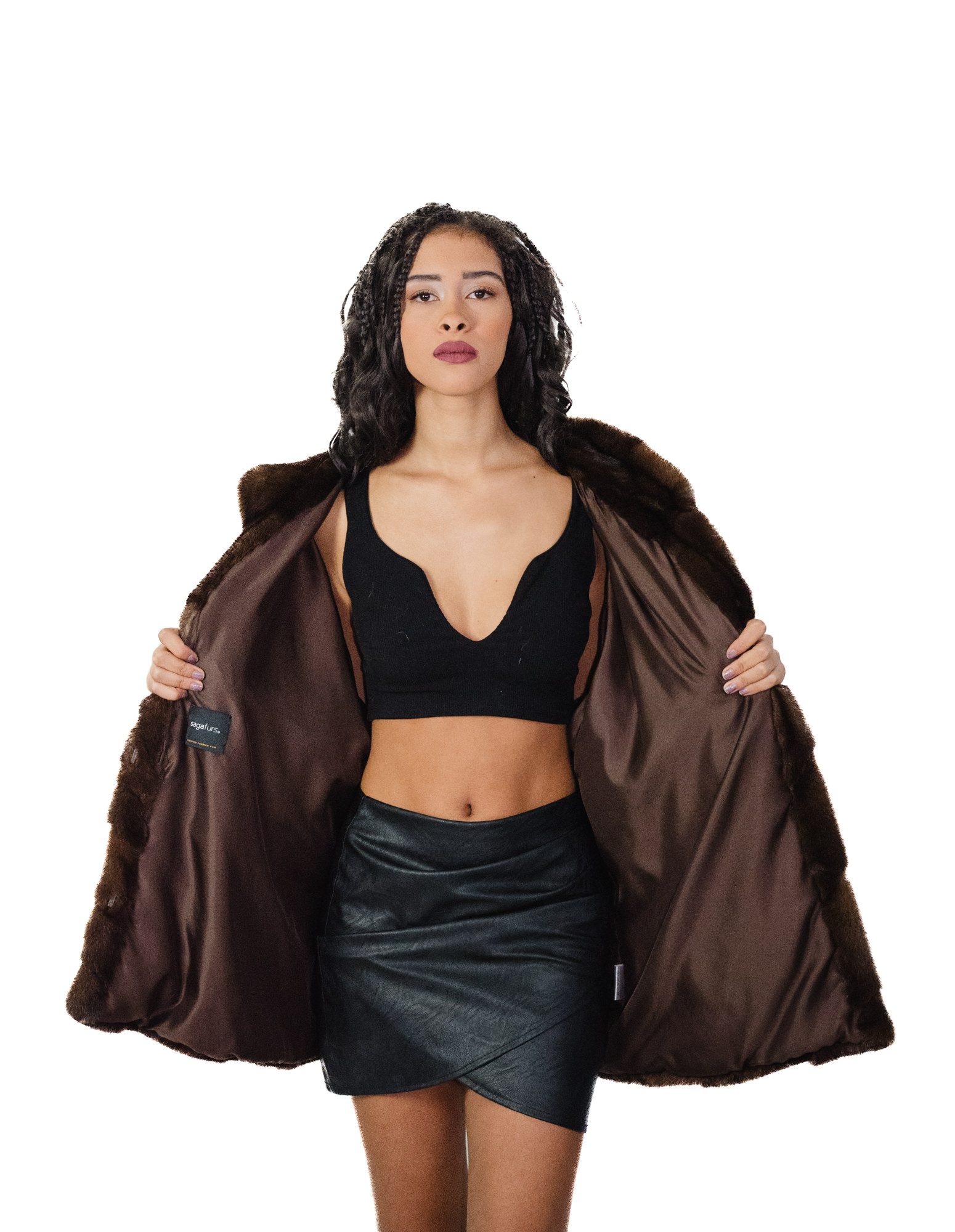 Vollfell-Nerzumhang in horizontaler V-Form. Unsere Nerzpelze werden in unseren eigenen Werkstätten hergestellt, daher eine einzigartige und exklusive Nerzjacke. Die Möglichkeit, unsere Pelze von höchster Qualität zu produzieren, erlaubt es uns, Angebote zu verschiedenen Preisen zu machen, wobei viele Schnäppchen zu niedrigen Preisen immer verfügbar sind. Außerdem garantieren unsere Werkstätten und Partnerschaften einen Nerzpelz von unbestrittener 100%iger Made in Italy Qualität. Die Qualität des weiblichen Nerzpelzes, der dafür verwendet wurde, ist eine Nerzpelzjacke mit Fellen der Marke Saga Furs. Die Nerzpelzjacke präsentiert sich in horizontaler V-Form mit einer schönen, mit Nerzpelz gefütterten Kapuze, Haken- und Ösenverschluss, normalen Außentaschen, Kordelzug unten und einem schönen dreiviertelärmeligen Cape in demi buff brown.