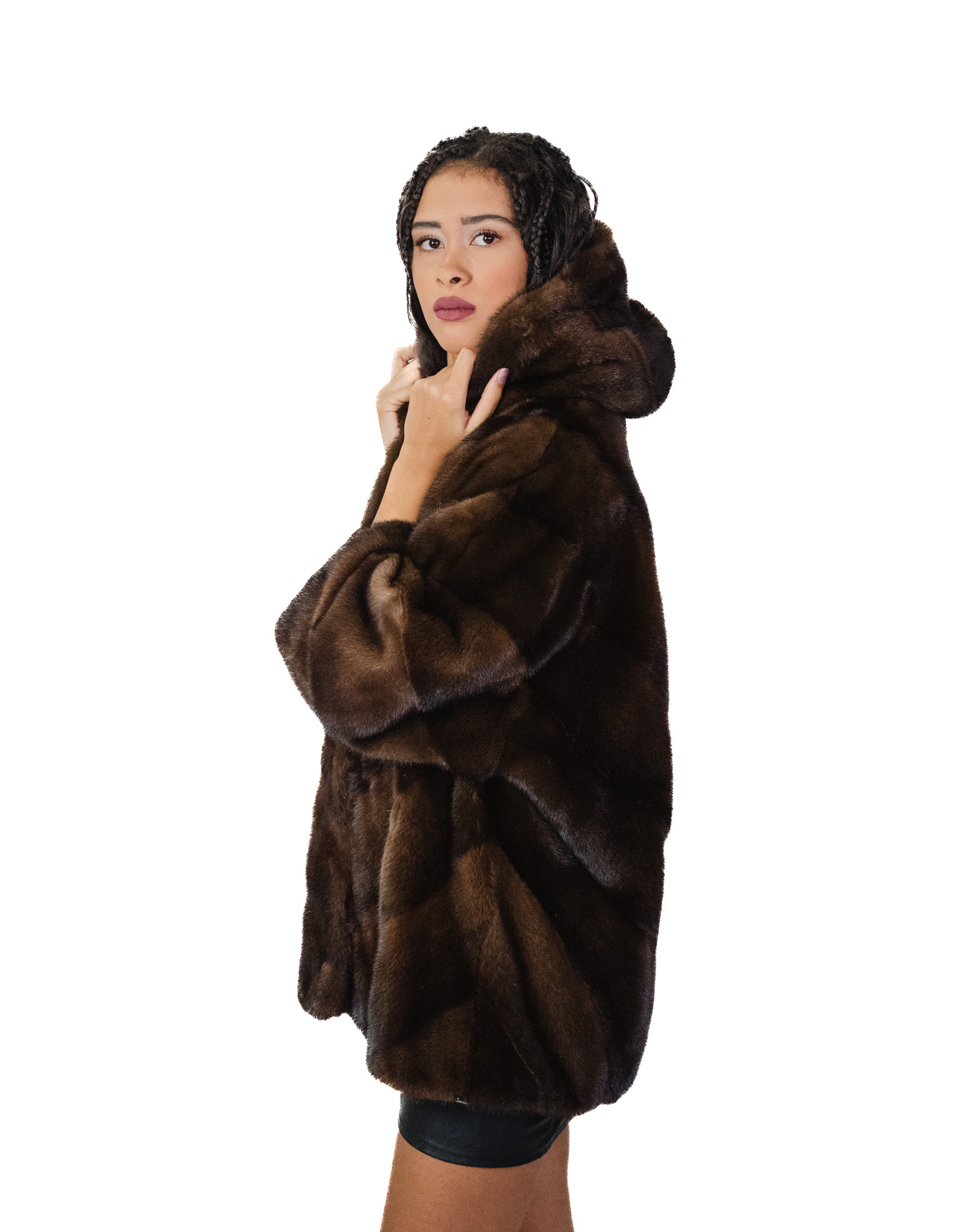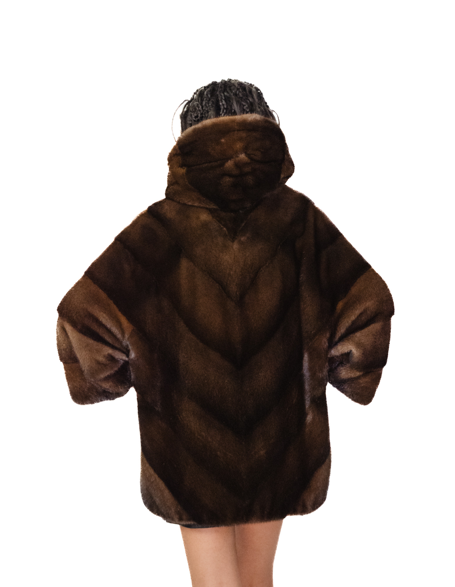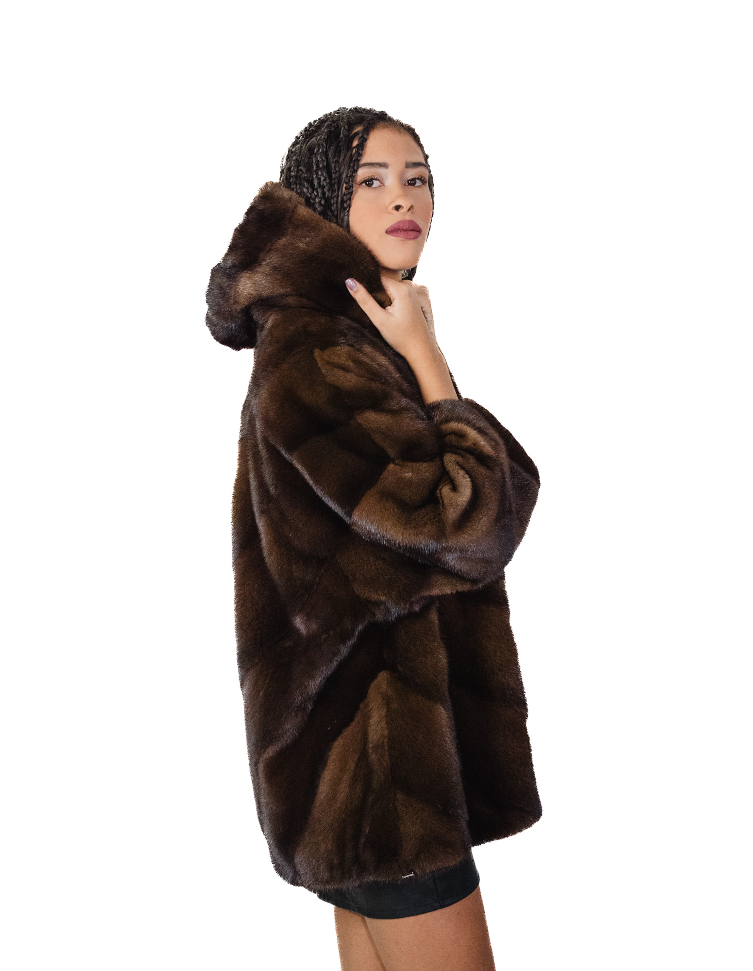 48-54 Brauner Demi-Nerz Pelzumhang V-förmige Kapuze Dreiviertel-Ärmel Kordelzug am Saum