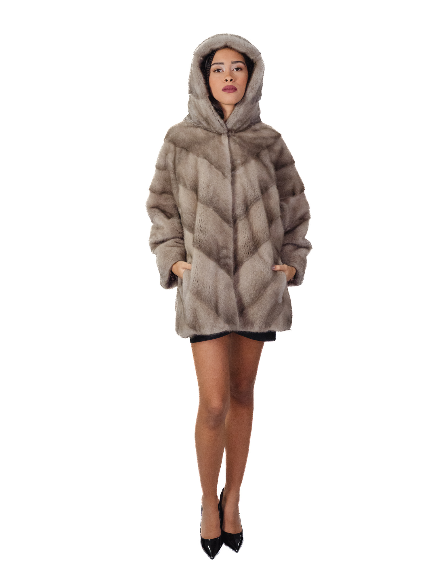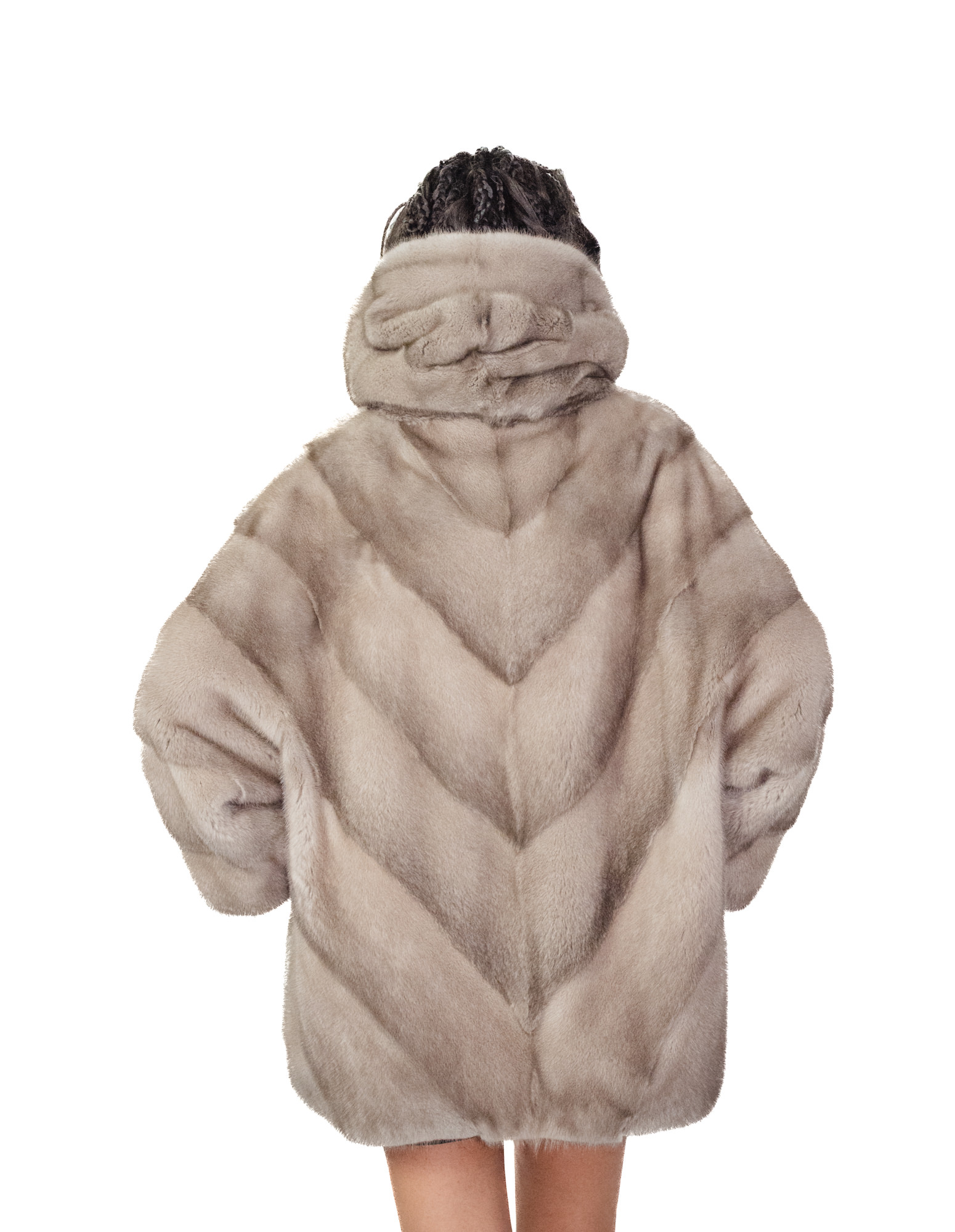 Vollfell-Nerzumhang in horizontaler V-Form. Unsere Nerzpelze werden in unseren eigenen Werkstätten hergestellt, daher eine einzigartige und exklusive Nerzjacke. Die Möglichkeit, unsere Pelze von höchster Qualität zu produzieren, erlaubt es uns, Angebote zu verschiedenen Preisen zu machen, wobei viele Schnäppchen zu niedrigen Preisen immer verfügbar sind. Außerdem garantieren unsere Werkstätten und Partnerschaften Nerzpelze von unbestrittener 100% Made in Italy Qualität. Die Qualität des weiblichen Nerzpelzes, der dafür verwendet wird, ist eine Nerzpelzjacke mit Fellen der Marke Saga Furs. Die Nerzpelzjacke ist in horizontaler V-Form gearbeitet und hat eine schöne, mit Nerzpelz gefütterte Kapuze, einen Haken- und Ösenverschluss, normale Außentaschen, einen Kordelzug an der Unterseite und einen schönen Umhang mit Dreiviertelärmel in Grau.