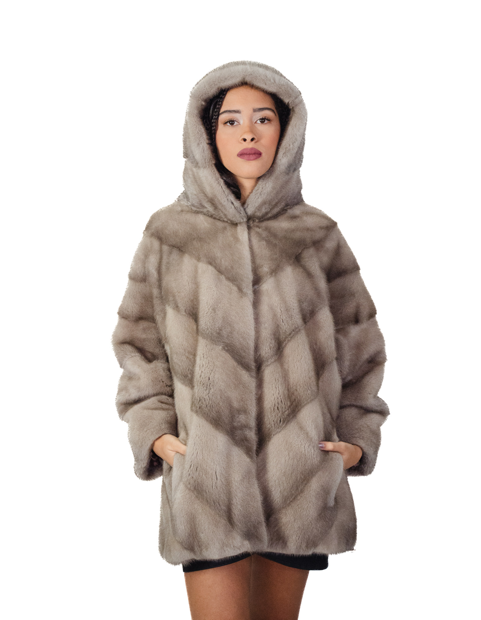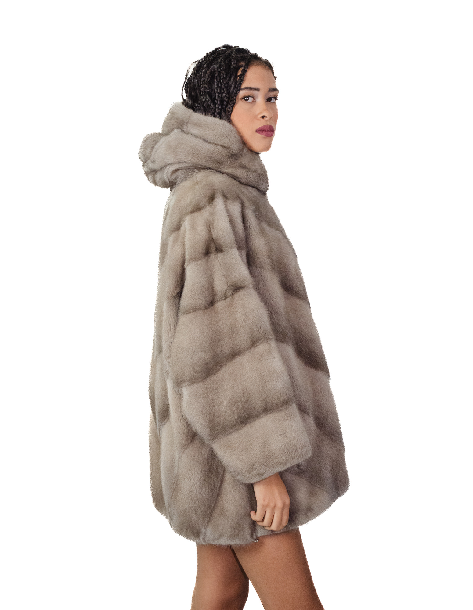 Home » Shop » 48-54 Grauer Nerzpelz Umhang V-förmige Kapuze Dreiviertel-Ärmel Kordelzug Saum