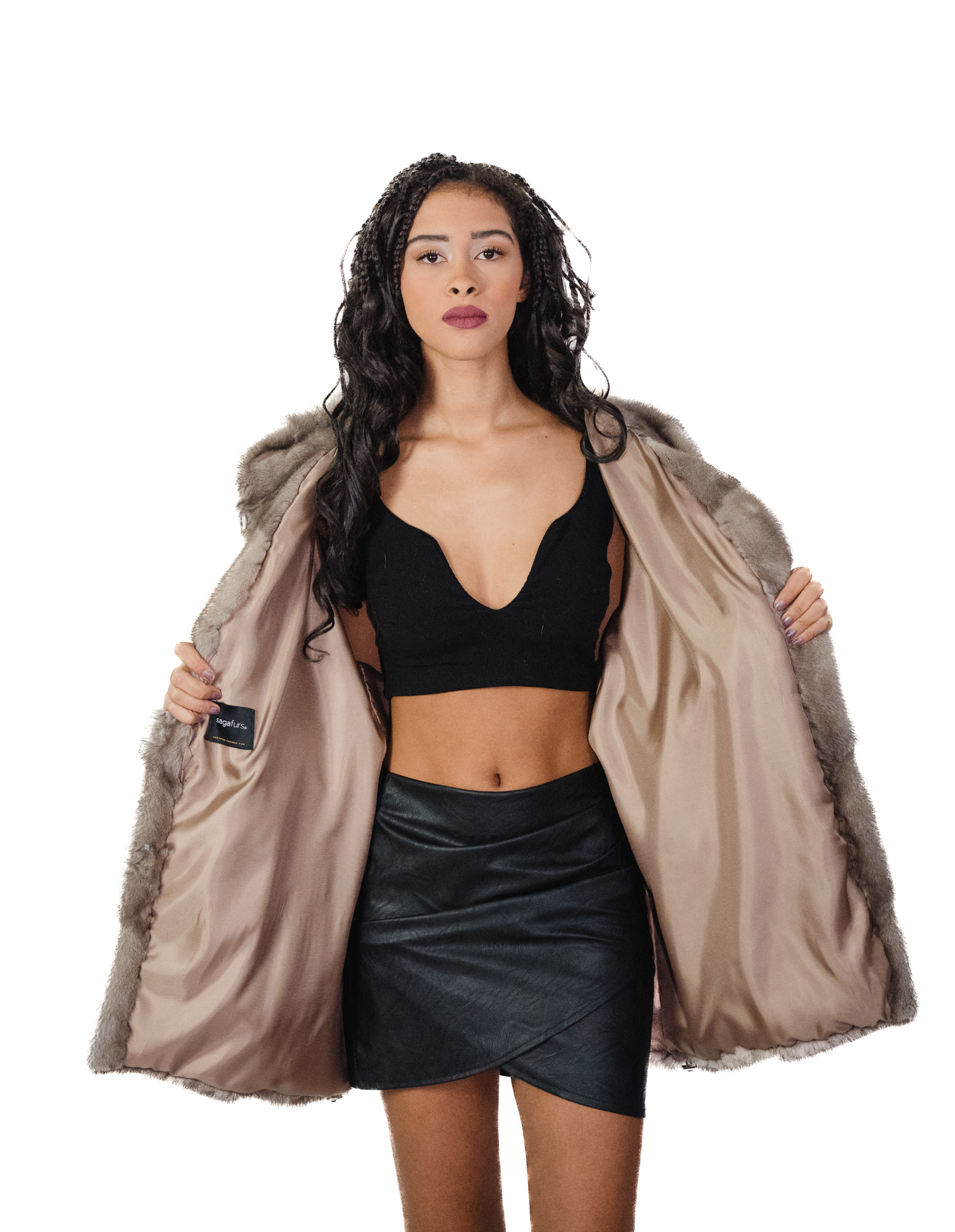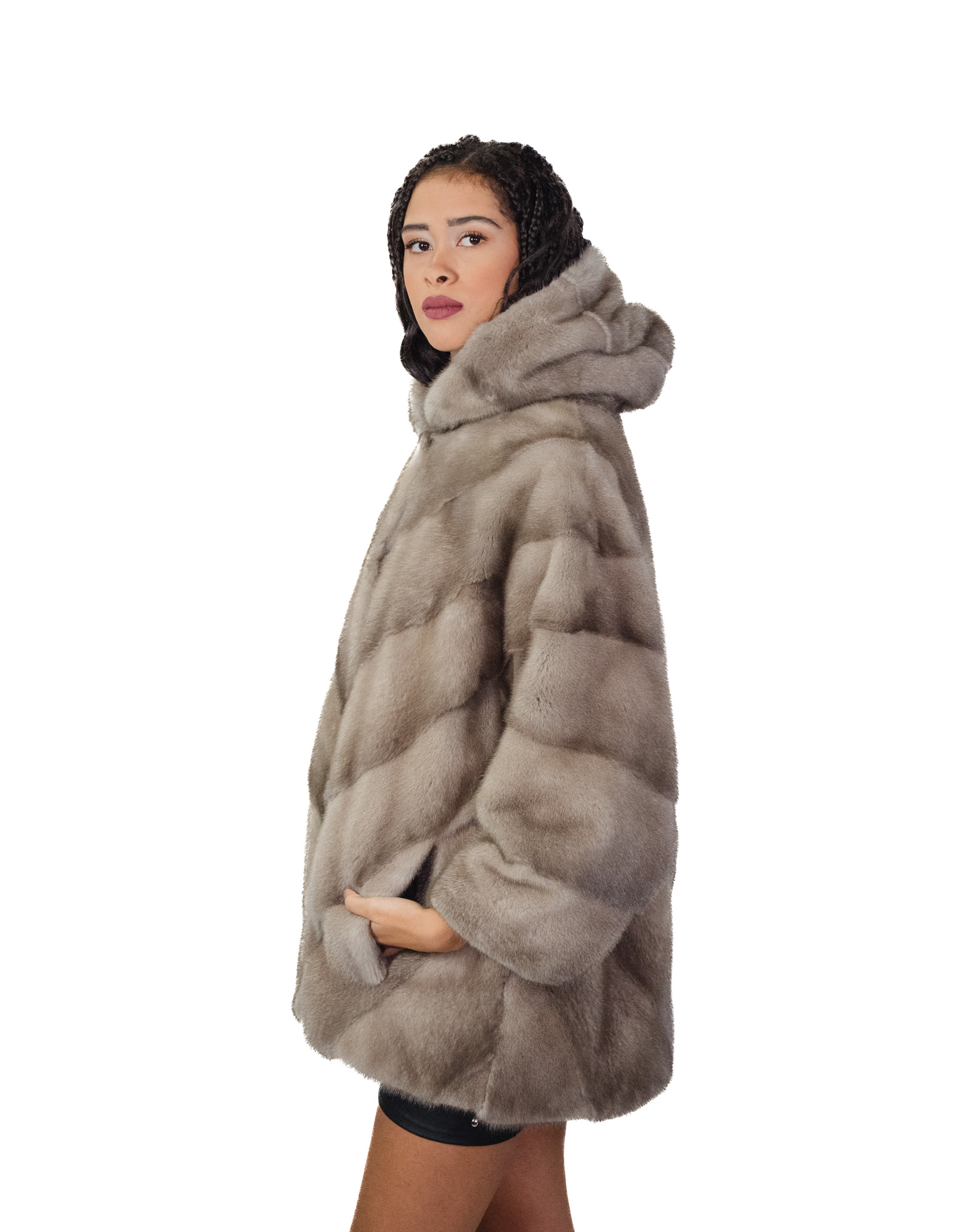 Saga Pelzmantel Nerz Pelz Demi 50 horizontal unten und Manschetten und volle Kapuze Leder