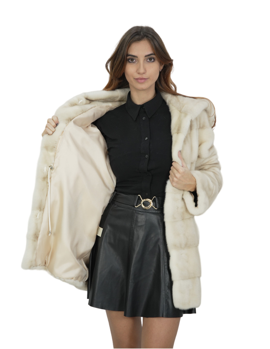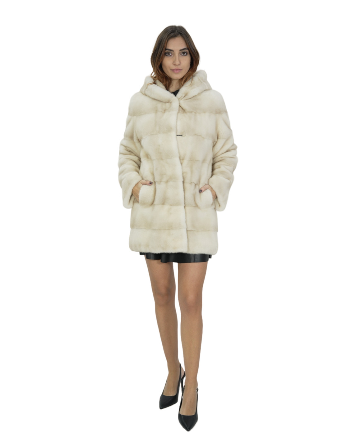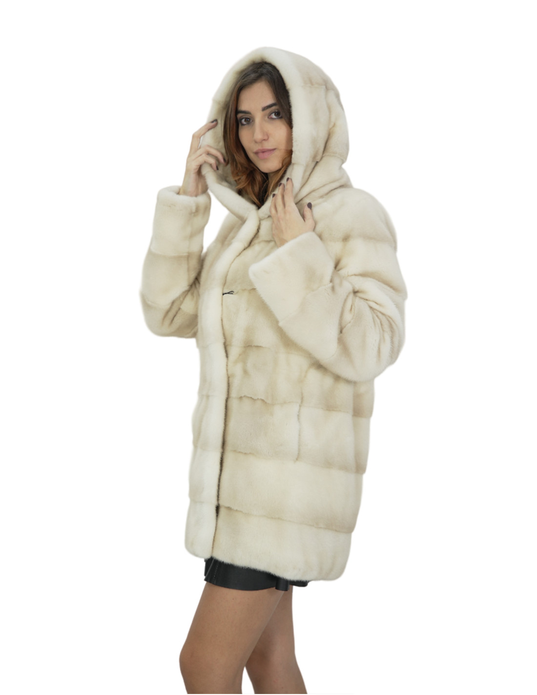 Beigefarbener horizontaler Vollfell-Nerzmantel mit pelzgefütterter Kapuze. Unsere Nerzpelze sind Produktionen, die in unseren Labors hergestellt werden, daher eine einzigartige und exklusive Nerzjacke. Die Möglichkeit, unsere Pelze in höchster Qualität herzustellen, ermöglicht es uns, Angebote zu unterschiedlichen Preisen zu unterbreiten, wobei immer verschiedene Möglichkeiten zu niedrigen Preisen verfügbar sind. Darüber hinaus garantieren unsere Labore und unsere Kooperationen einen Nerzpelz von unbestrittener Qualität, der zu 100 % in Italien hergestellt wird. Die hier verwendete Qualität aus weiblichem Nerzfell ist eine Nerzpelzjacke mit Häuten von Copenhagen Furs. Die Nerzpelzjacke in horizontaler Verarbeitung, 78 Zentimeter lang, lange Ärmel, Verschluss mit innenliegenden Haken, Kordelzug in der Taille mit Kapuze, alles in Beige.