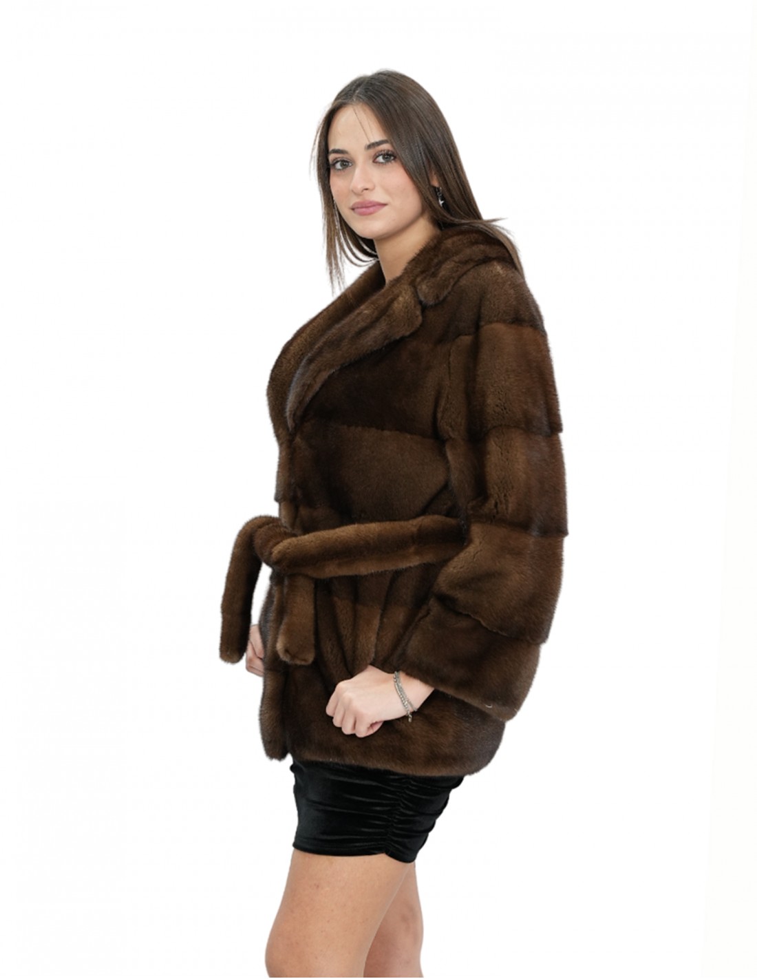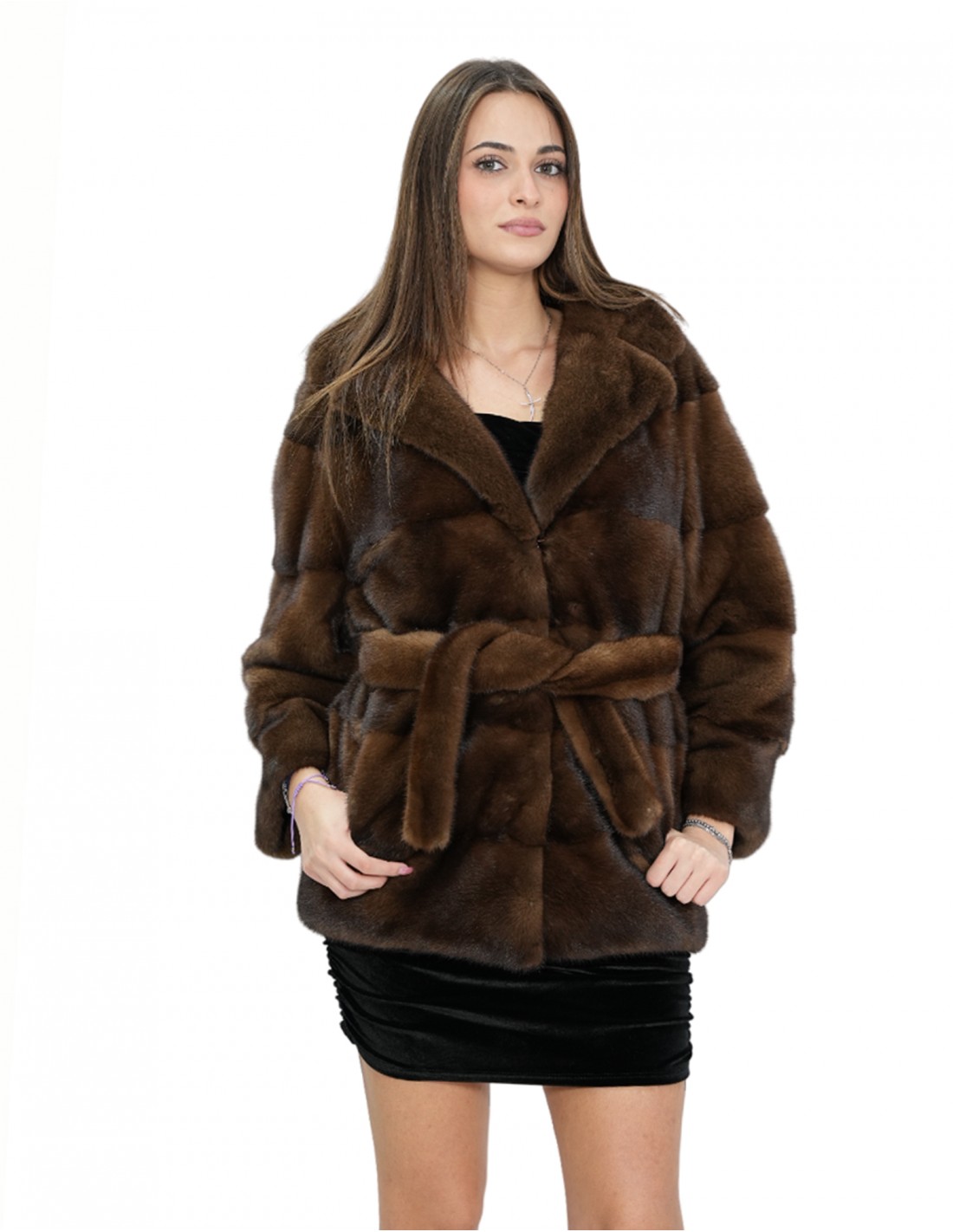 Demi 44 Nerzfelljacke mit Brustkragen und horizontalem Revers mit innenliegenden Haken und Gürtelverschluss