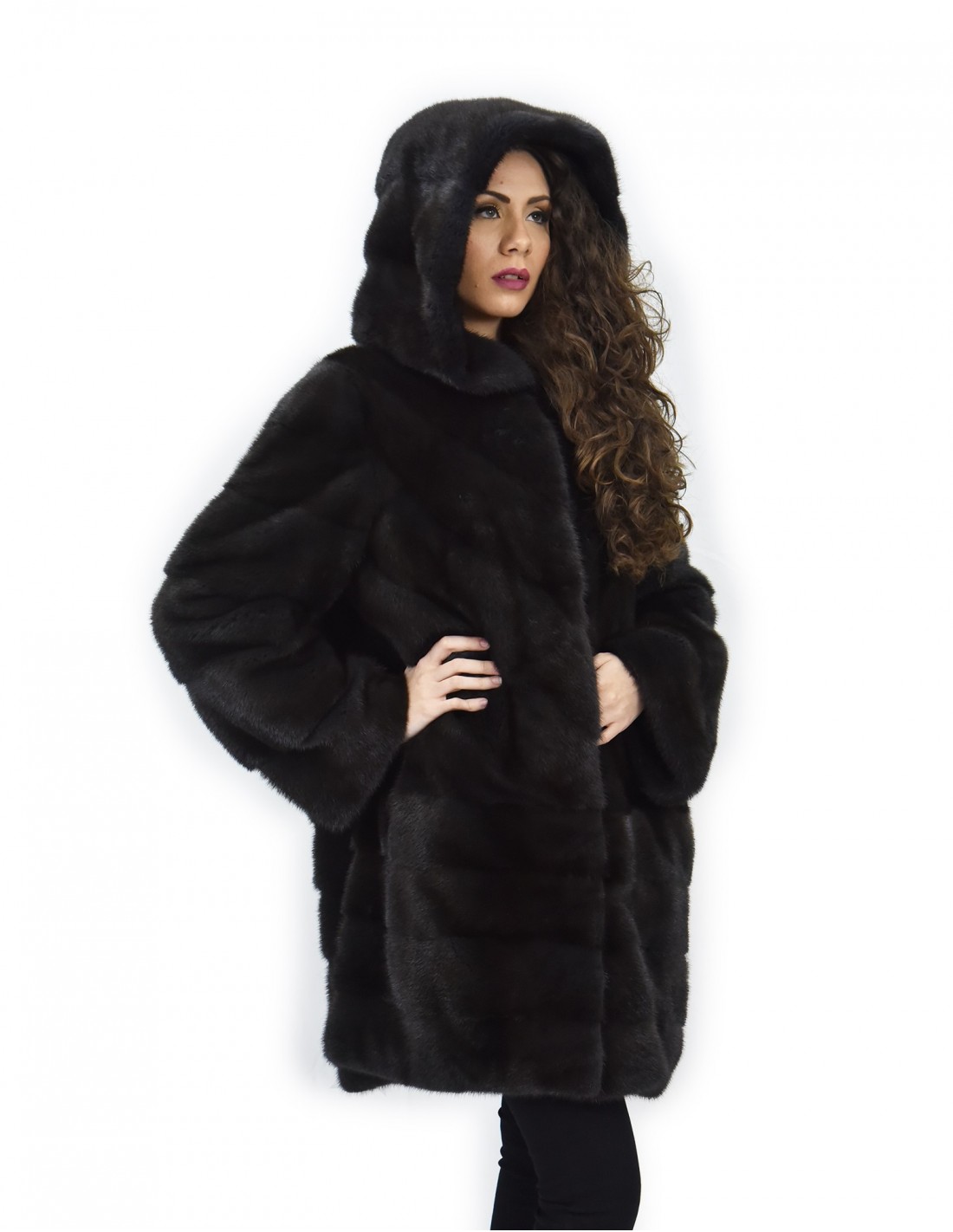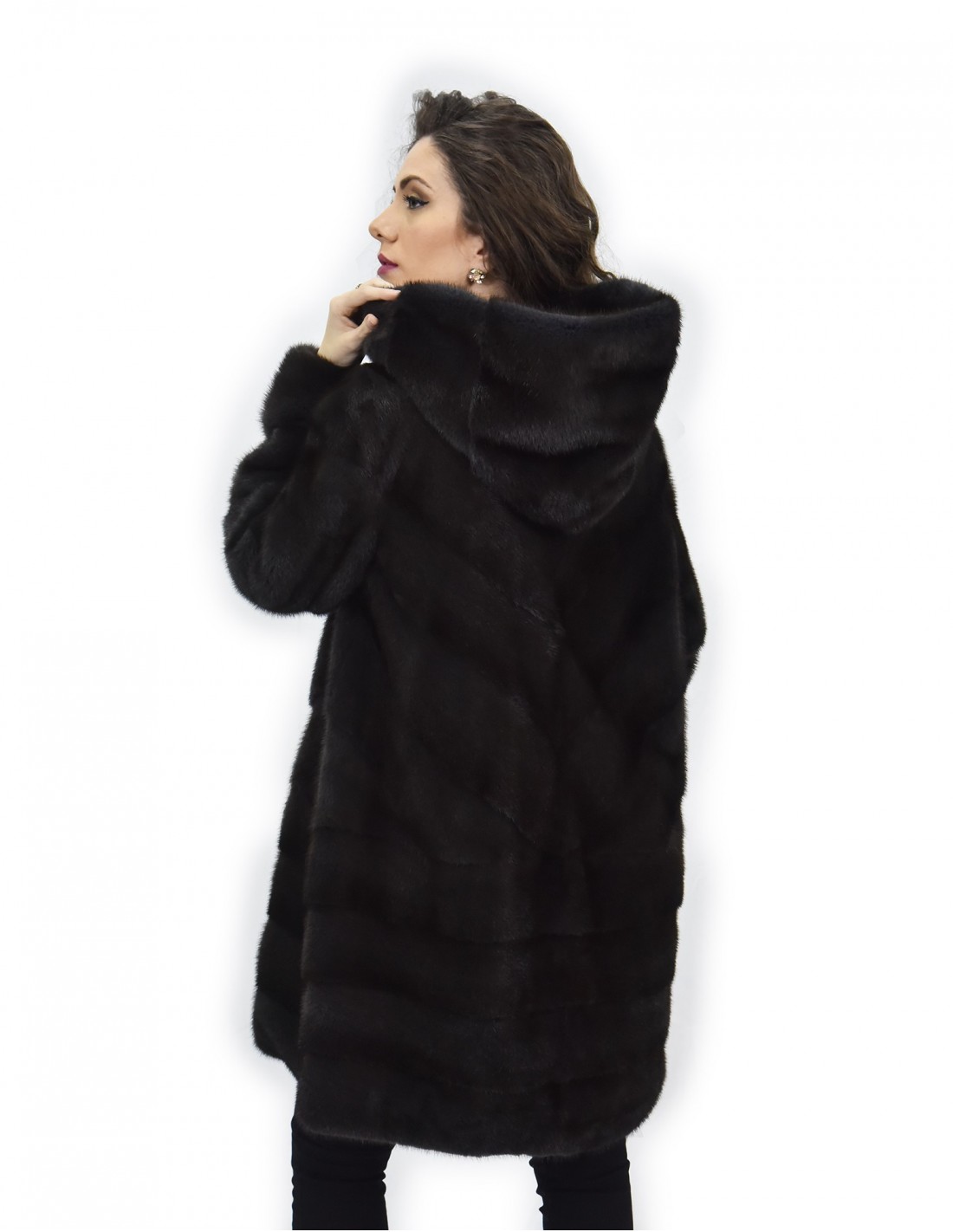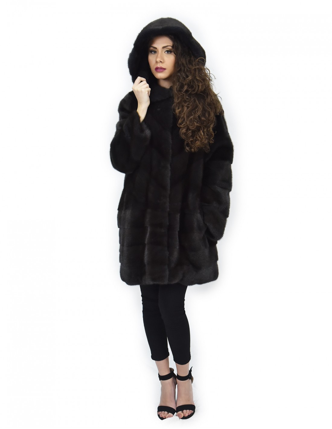 {Manakas Frankfurt branded whole skin mink coat. Our mink furs are productions made in our workshops, therefore a unique and exclusive mink coat. The possibility of producing our furs of the highest quality allows us to make proposals at different prices with various occasions at low prices always available. Furthermore, our laboratories and our collaborations guarantee a mink fur of undisputed quality 100% made in Italy. The quality of female mink fur used for this is a mink fur jacket with Kopenhagen Fur branded skins. The dyed aurora mink fur jacket comes in a 88 cm long bell-shaped model with a beautiful hood lined in mink skins, long sleeves, in mink fur whole skins horizontal processing in the lower part and in the transverse upper part, hook closure and normal external pockets.
