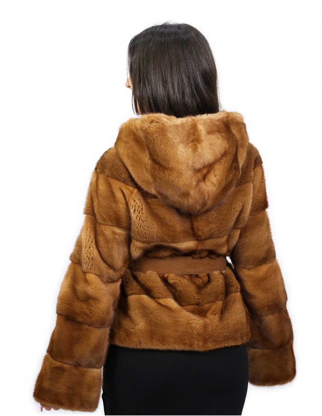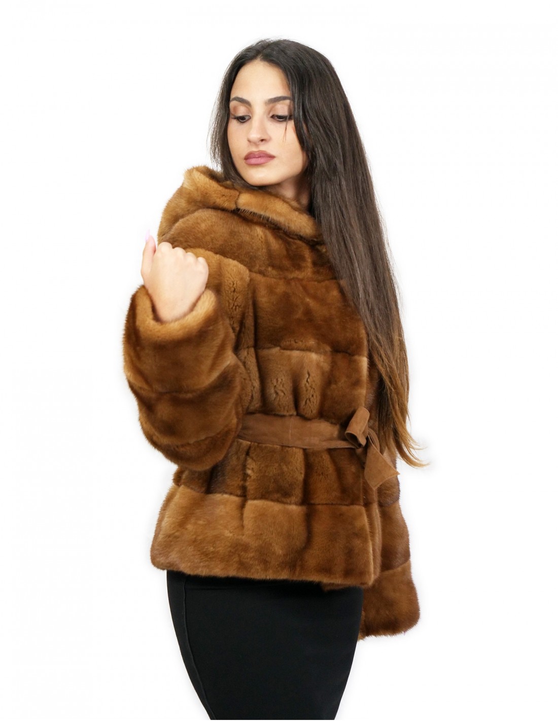 Jacke 50 Mink horizontale Kapuze Wildledergürtel Außentaschen