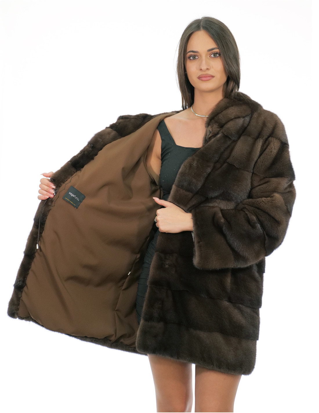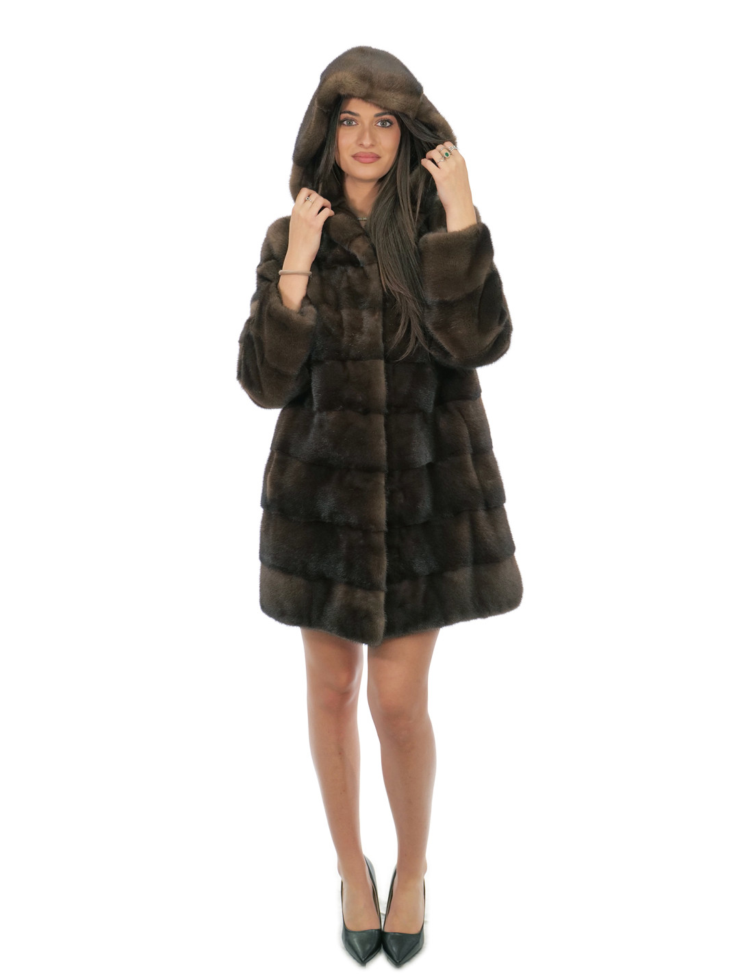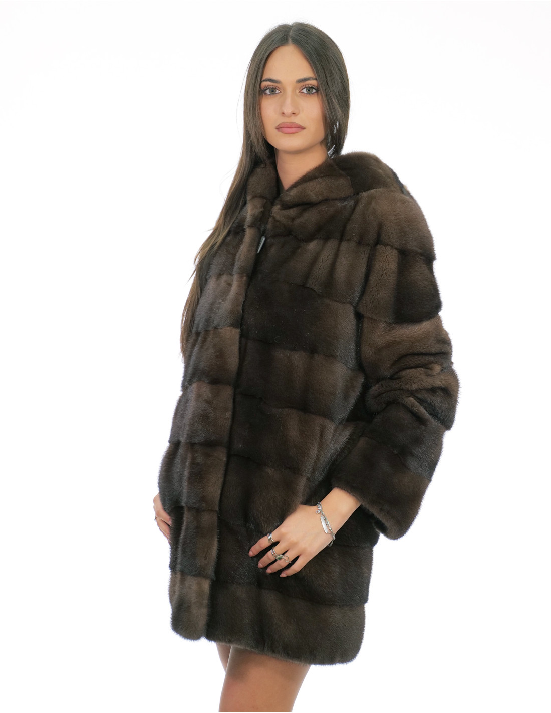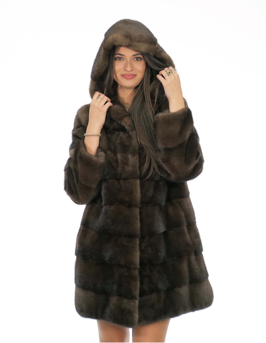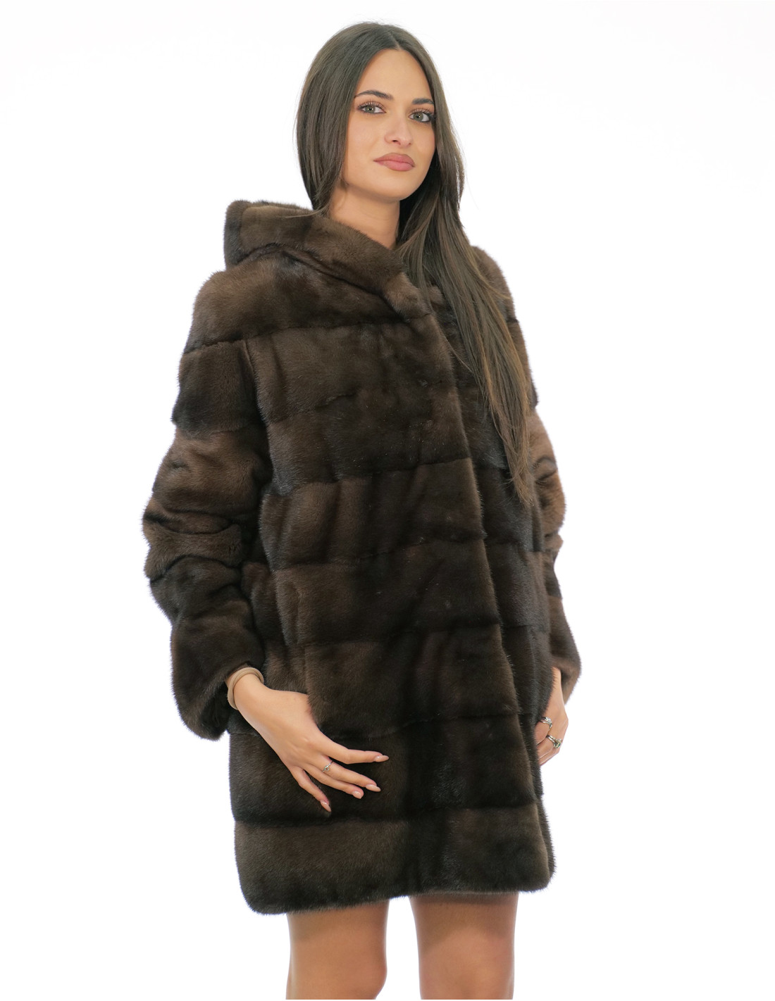 Ganzhaut-Nerzmantel mit horizontaler Verarbeitung. Unsere Nerzpelze sind Produkte aus unseren Laboren und daher einzigartige und exklusive Nerzjacken. Die Fähigkeit, unsere Pelze in höchster Qualität herzustellen, ermöglicht es uns, Angebote zu unterschiedlichen Preisen zu unterbreiten, wobei für verschiedene Anlässe stets günstige Preise verfügbar sind. Darüber hinaus garantieren unsere Labore und unsere Zusammenarbeit ein Nerzfell von unbestrittener Qualität, 100 % Made in Italy. Bei der hierfür verwendeten Qualität des weiblichen Nerzfells handelt es sich um eine Nerzfelljacke der Marke Saga Furs. Der 82 cm lange, horizontal gearbeitete Nerzpelzmantel verfügt über seitliche Außentaschen, einen Hakenverschluss und eine mit Nerzpelz gefütterte Kapuze, alles in der Farbe Demi Buff.