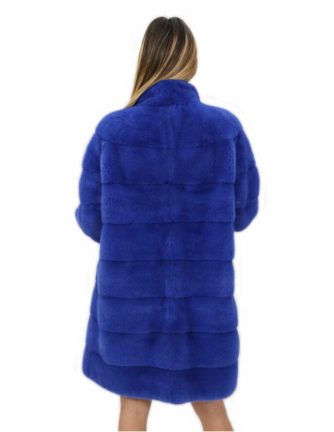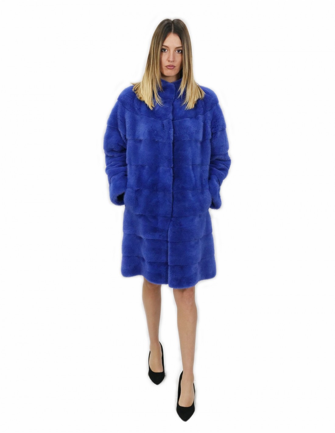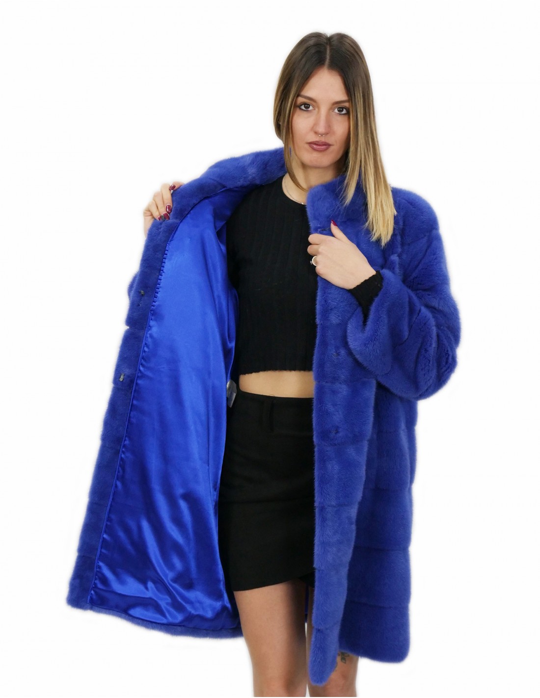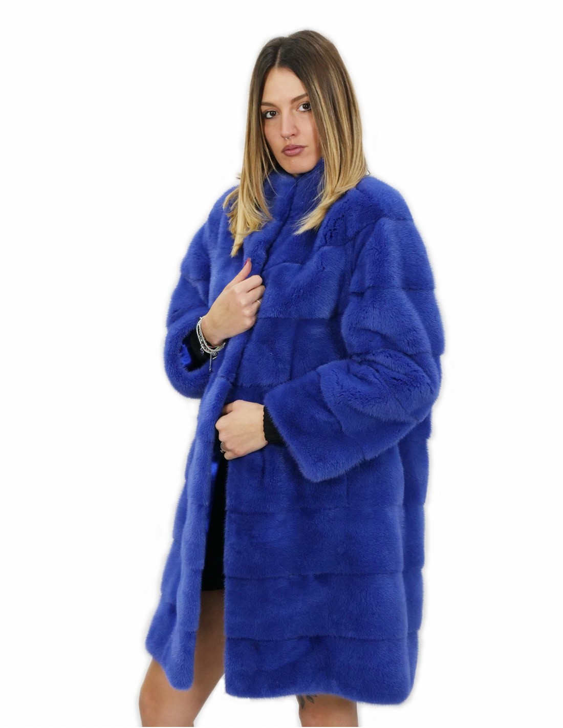 Horizontale Vollfell-Nerzjacke. Unsere Nerzpelze sind Produktionen, die in unseren Labors hergestellt werden, daher eine einzigartige und exklusive Nerzjacke. Die Möglichkeit, unsere Pelze in höchster Qualität herzustellen, ermöglicht es uns, Angebote zu unterschiedlichen Preisen zu unterbreiten, wobei immer verschiedene Möglichkeiten zu niedrigen Preisen verfügbar sind. Darüber hinaus garantieren unsere Labore und unsere Kooperationen einen Nerzpelz von unbestrittener Qualität, der zu 100 % in Italien hergestellt wird. Die Qualität des weiblichen Nerzpelzes, die hierfür verwendet wird, ist eine Nerzpelzjacke mit Fellen der Marke Saga Furs. Die 92 Zentimeter lange horizontale Nerzpelzjacke verfügt über Außentaschen, einen Hakenverschluss und einen Paspelkragen in Blau.