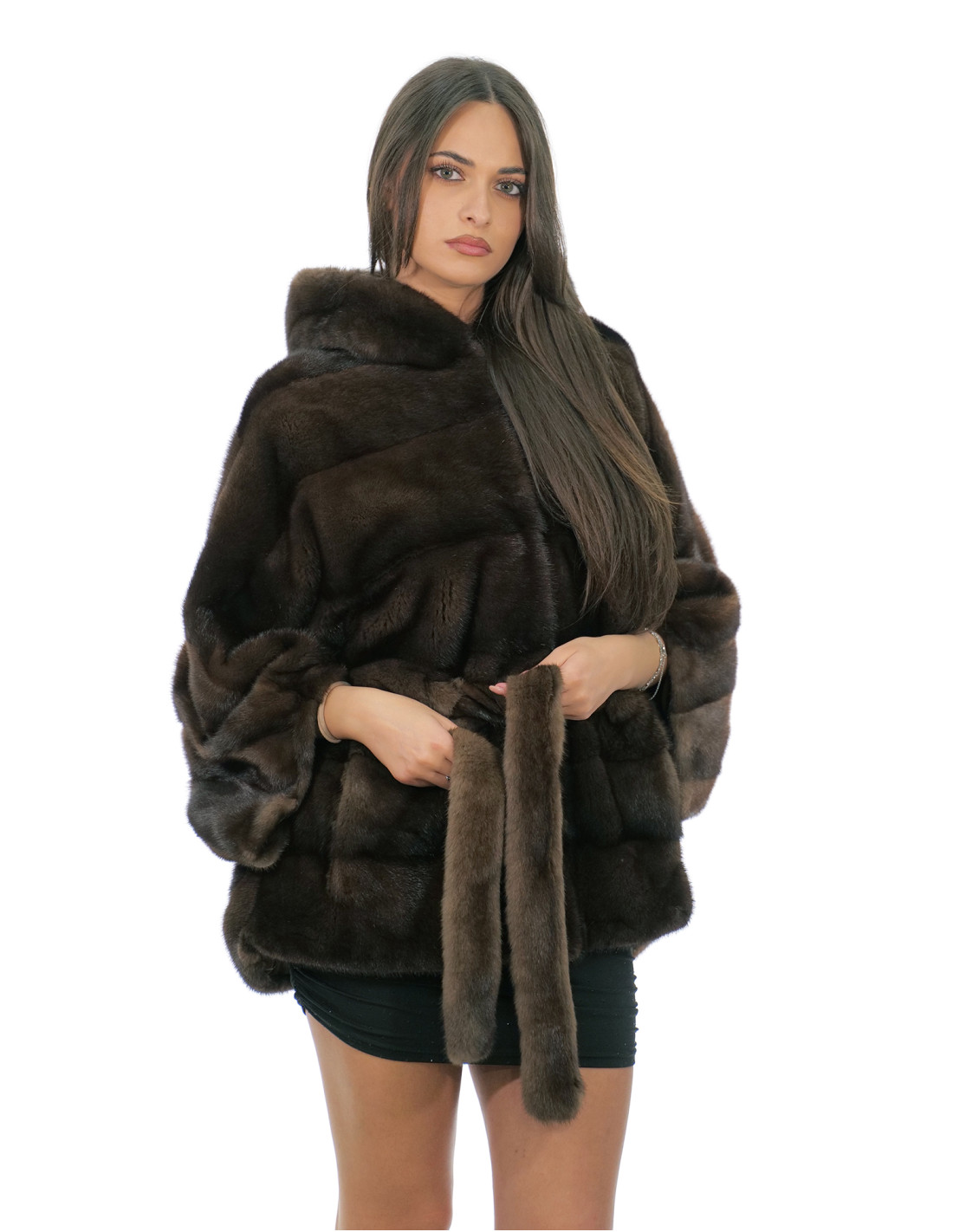 Nerz Cape Full Skins horizontal gestrickt 48-56 demi Dreiviertelärmel pelzgefütterte Kapuze