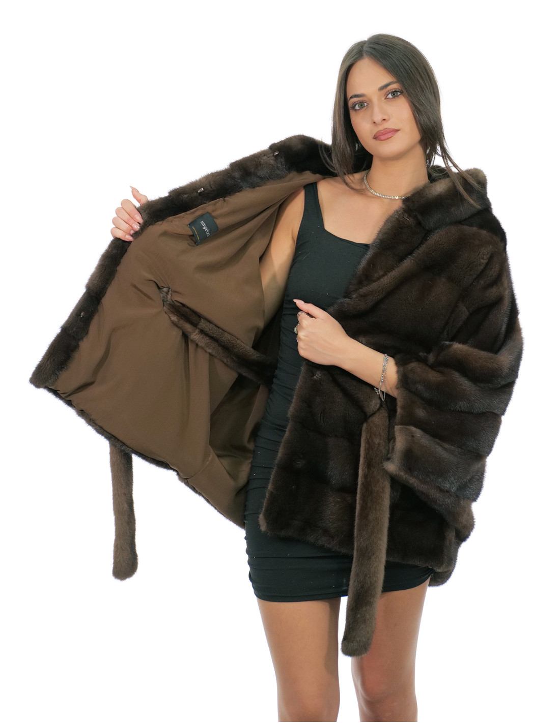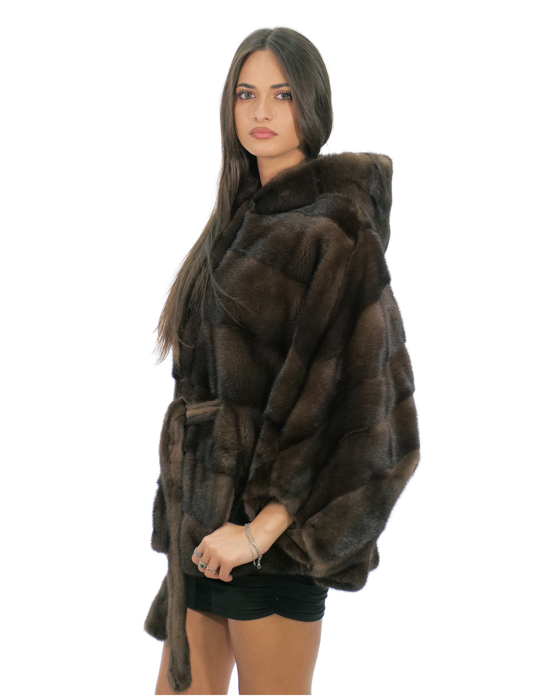 Ganzhaut-Nerzpelzjacke in horizontaler Verarbeitung. Unsere Nerzpelze sind Produkte aus unseren Laboren und daher einzigartige und exklusive Nerzjacken. Die Fähigkeit, unsere Pelze in höchster Qualität herzustellen, ermöglicht es uns, Angebote zu unterschiedlichen Preisen zu unterbreiten, wobei für verschiedene Anlässe stets günstige Preise verfügbar sind. Darüber hinaus garantieren unsere Labore und unsere Zusammenarbeit ein Nerzfell von unbestrittener Qualität, 100 % Made in Italy. Die hierfür verwendete Qualität des weiblichen Nerzfells ist eine Nerzpelzjacke mit Fellen der Marke Saga Furs. Der Nerzpelzumhang in horizontaler Verarbeitung ist 78 Zentimeter lang, mit Dreiviertelärmeln, Hakenverschluss und mit Nerzpelz gefütterter Kapuze, normale Außentaschen.