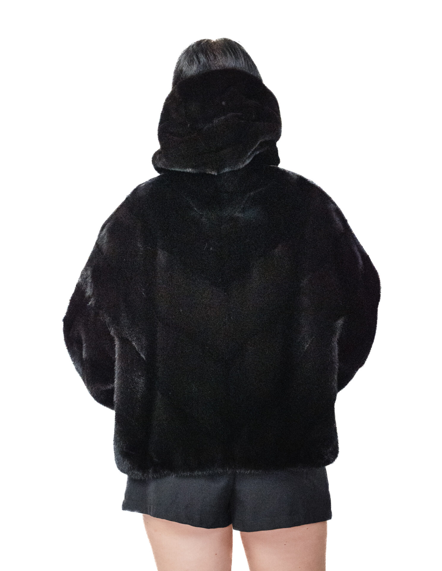 Nerzpelz-Cape-Jacke mit V-Ausschnitt, 60 cm lang, Größe 48-56, schwarze, pelzgefütterte Kapuze