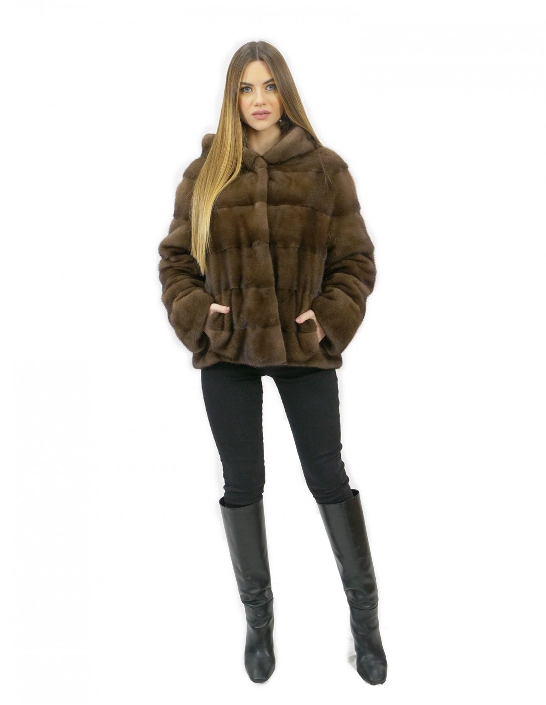 Nerzjacke mit ganzen Fellen in horizontaler Verarbeitung. Unsere Nerzfelle werden in unseren Werkstätten hergestellt, daher eine einzigartige und exklusive Nerzjacke. Die Möglichkeit, unsere Pelze von höchster Qualität herzustellen, ermöglicht es uns, Vorschläge zu verschiedenen Preisen mit verschiedenen Anlässen zu immer günstigen Preisen zu machen. Darüber hinaus garantieren unsere Labore und unsere Kooperationen ein Nerzfell von unbestrittener Qualität, das zu 100% in Italien hergestellt wird. Die dafür verwendete Qualität des weiblichen Nerzfells ist eine Nerzjacke mit Saga-Fell-Markenfellen. Die Nerzpelzjacke kommt in einem wunderschönen braunen Farbton mit einer schönen Kapuze, die auch innen komplett mit ganzen Nerzfellen gefüttert ist, langen Ärmeln und normalen Außentaschen.
