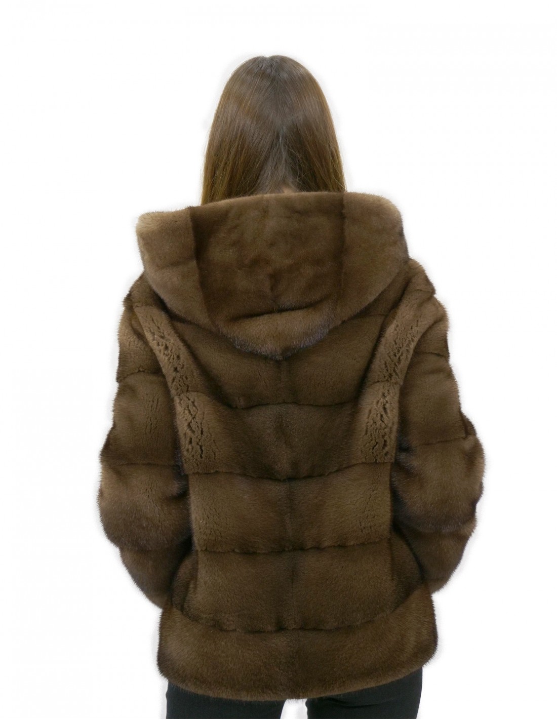 Pelzjacke 54 Nerz horizontal mit brauner Kapuze 62 Zentimeter lange Außentaschen