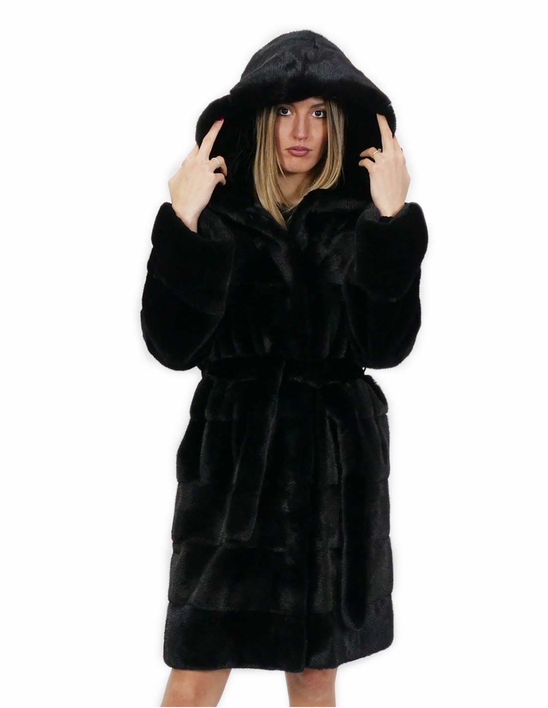 Nerzmantel mit ganzen Fellen in horizontaler Verarbeitung. Unsere Nerzpelze sind in unseren Labors hergestellte Produkte, daher ein einzigartiger und exklusiver Nerzmantel. Die Möglichkeit, unsere Pelze von höchster Qualität herzustellen, ermöglicht es uns, Vorschläge zu unterschiedlichen Preisen mit verschiedenen Möglichkeiten zu niedrigen Preisen zu machen, die immer verfügbar sind. Darüber hinaus garantieren unsere Labors und unsere Kooperationen ein Nerzfell von unbestrittener Qualität, das zu 100 % in Italien hergestellt wird. Die Qualität des dafür verwendeten weiblichen Nerzpelzes ist ein Nerzmantel mit Häuten, die von Kopenhagener Pelzen signiert sind. Die Nerzjacke ist 100 cm lang mit Außentaschen, Hakenverschluss und mit Nerzfellen gefütterter Kapuze, Pelzgürtel, alles in einer schönen schwarzen Farbe.