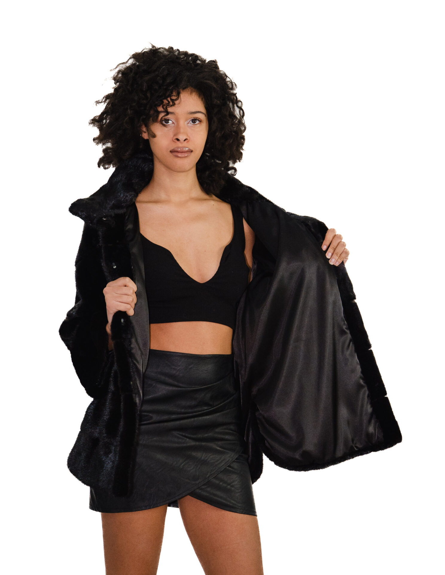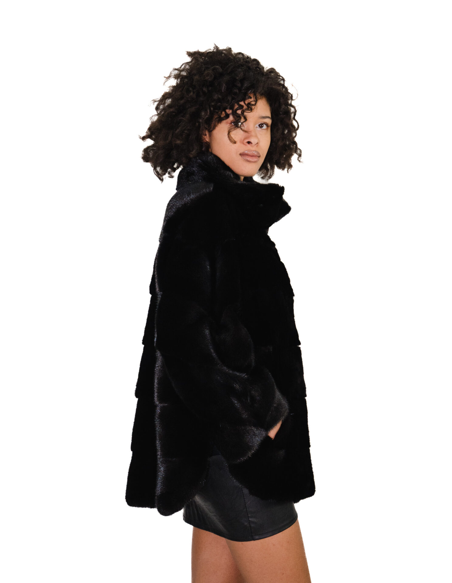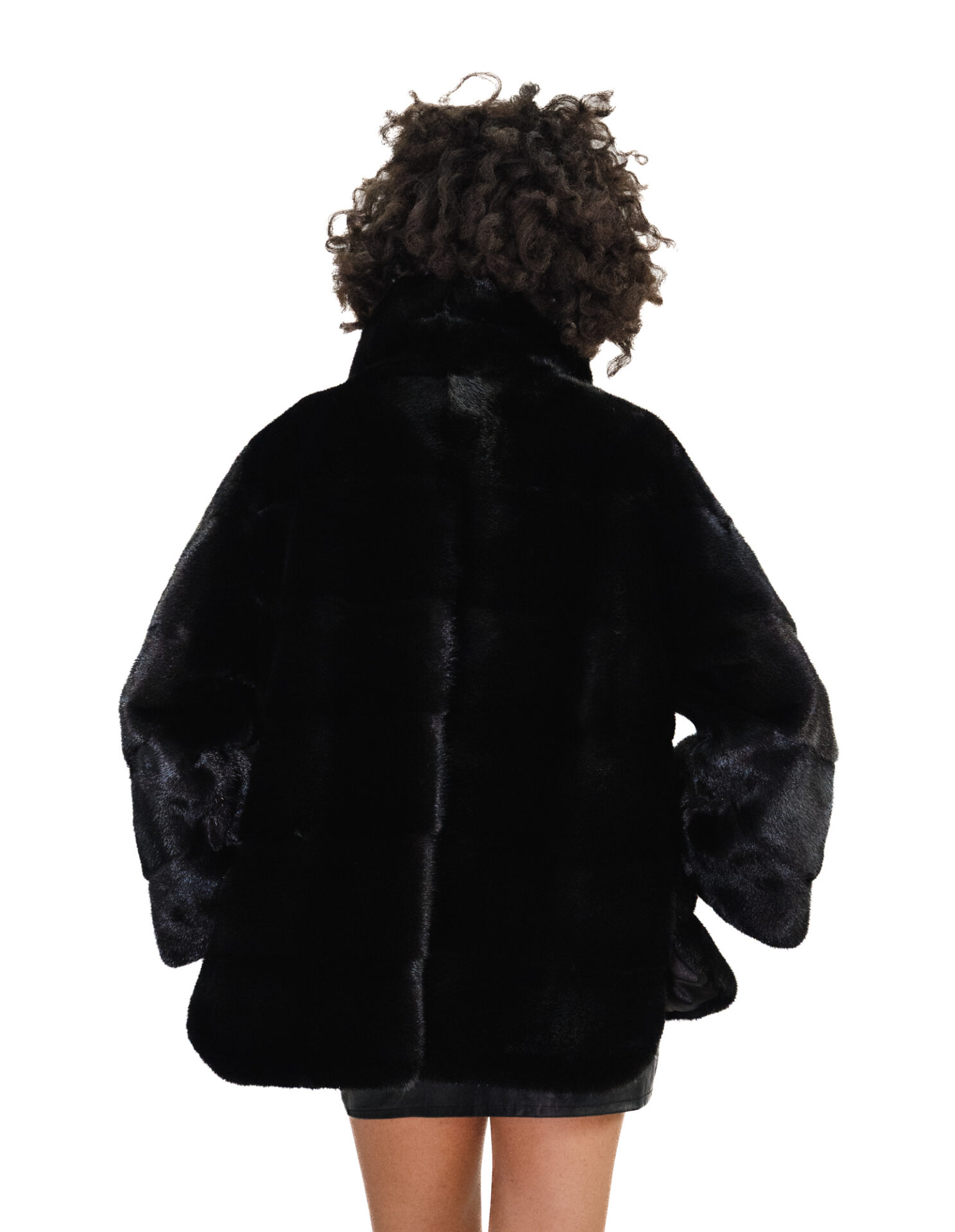 Home » Shop » Schwarzer Nerzmantel mit horizontalem Schnitt, Größe 44, mit V-förmigen Ärmeln, Paspelierung am Halsausschnitt und Magnetverschluss.