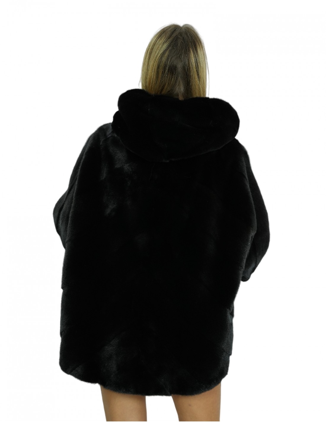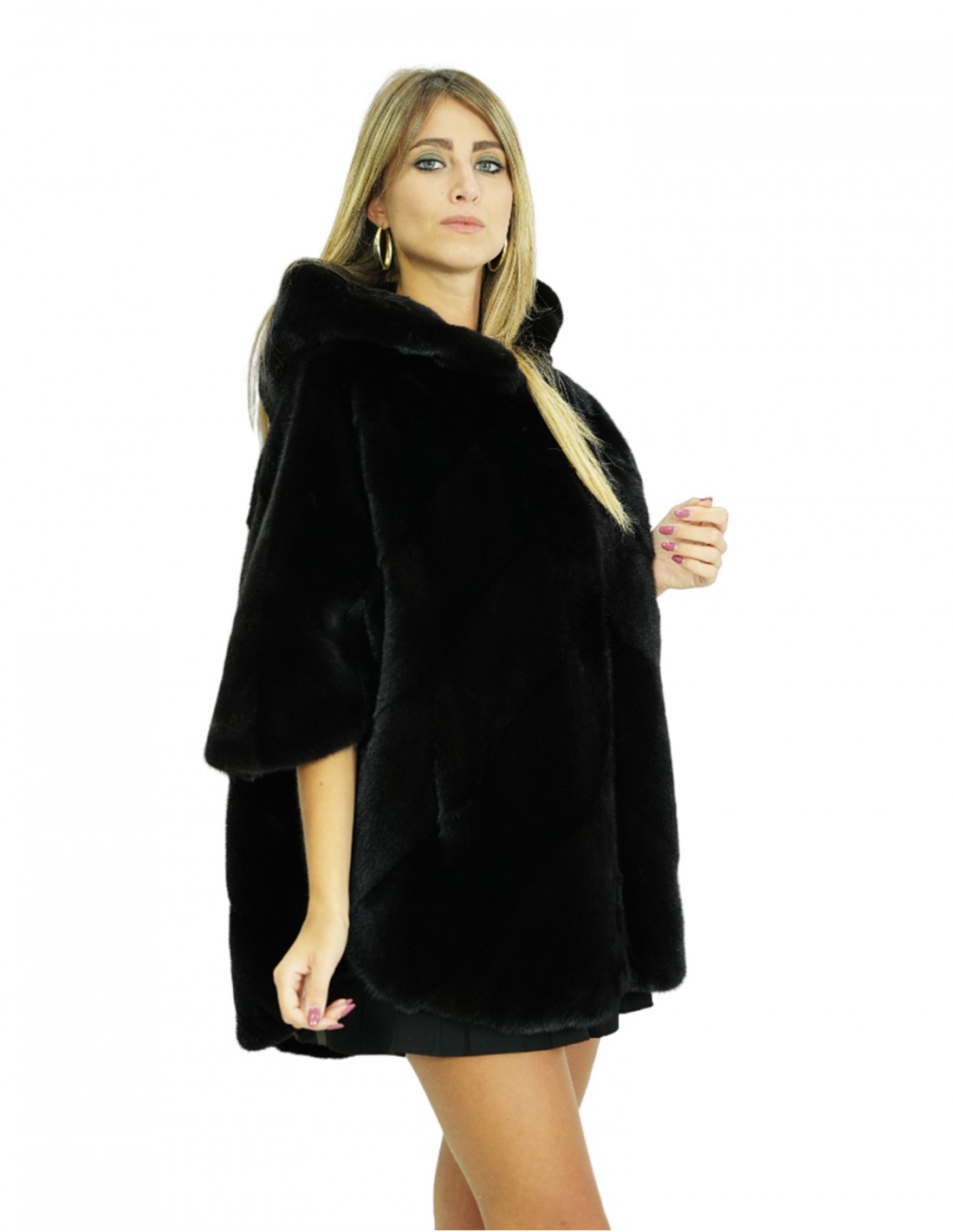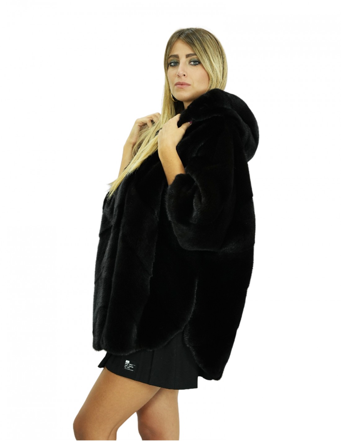 Nerzumhang mit ganzen Querfellen in Schwarz. Unsere Nerzpelze sind Produktionen, die in unseren Labors hergestellt werden, daher eine einzigartige und exklusive Nerzjacke. Die Möglichkeit, unsere Pelze in höchster Qualität herzustellen, ermöglicht es uns, Angebote zu unterschiedlichen Preisen zu unterbreiten, wobei immer verschiedene Möglichkeiten zu niedrigen Preisen verfügbar sind. Darüber hinaus garantieren unsere Labore und unsere Kooperationen einen Nerzpelz von unbestrittener Qualität, der zu 100 % in Italien hergestellt wird. Bei der hierfür verwendeten weiblichen Nerzfellqualität handelt es sich um eine Nerzfelljacke mit Häuten signiertem Copenhagen-Fell. Der quer verlaufende Umhang aus Nerzpelz ist 72 Zentimeter lang, hat 3/4-Ärmel, einen Verschluss mit inneren Haken und eine mit Mahagoni-Nerzfellen gefütterte Kapuze mit seitlichen Schlitzen.