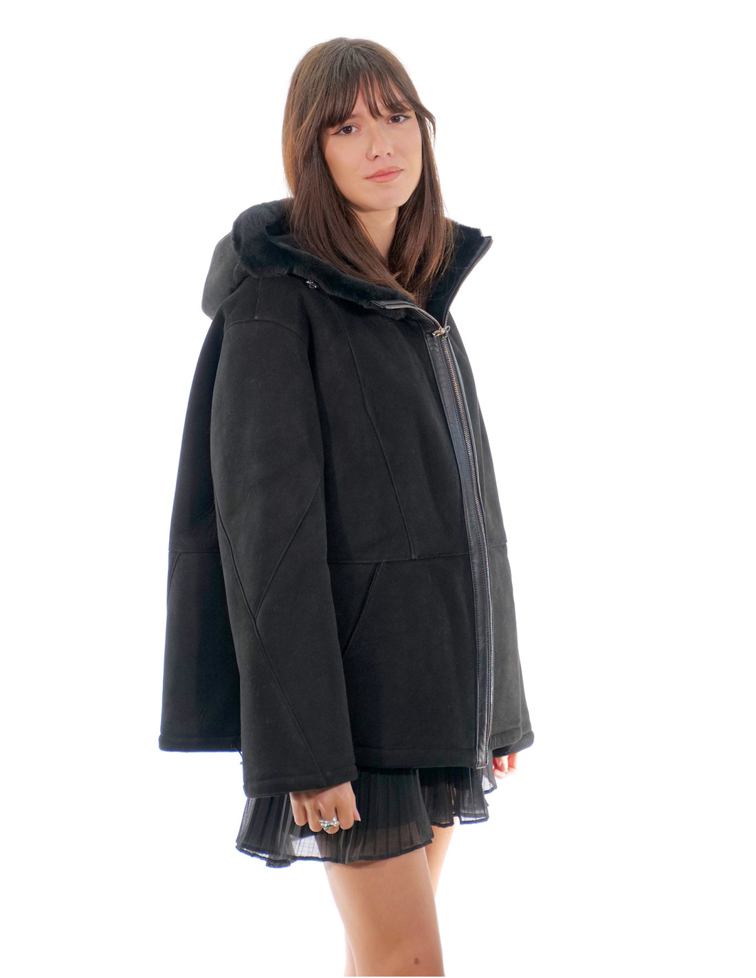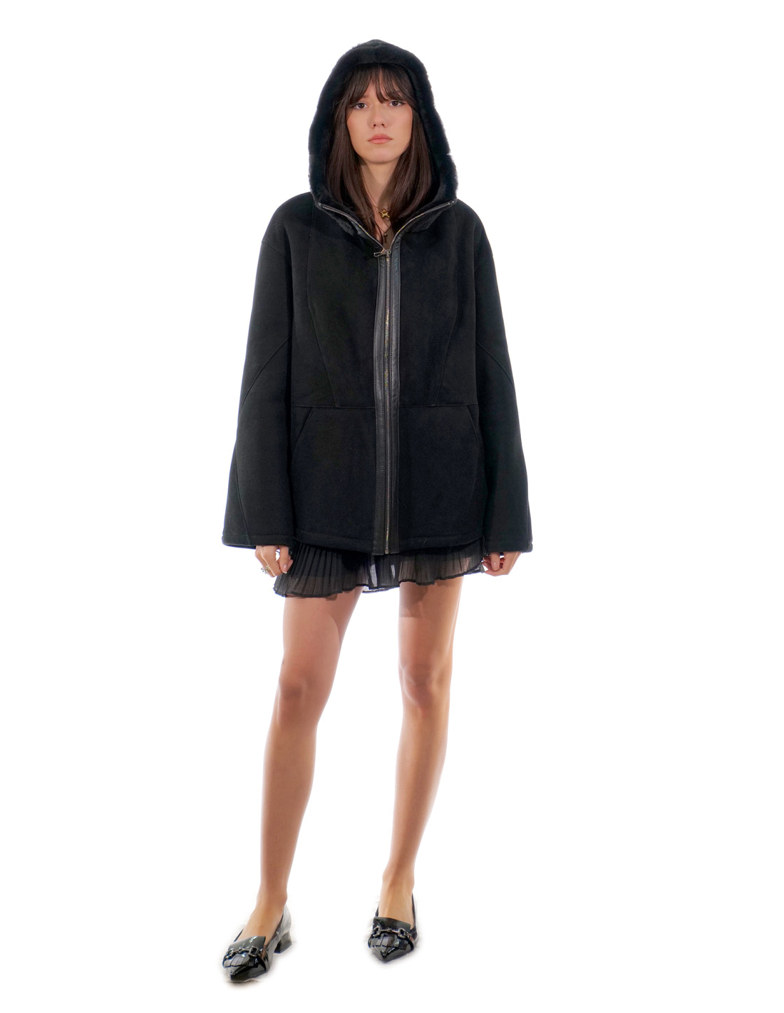 Lammfellmantel 54, schwarzer Kordelzug, Saum und Ärmelbündchen, Fellinnenseite, Leder, Außenseite, Kapuze, Reißverschluss