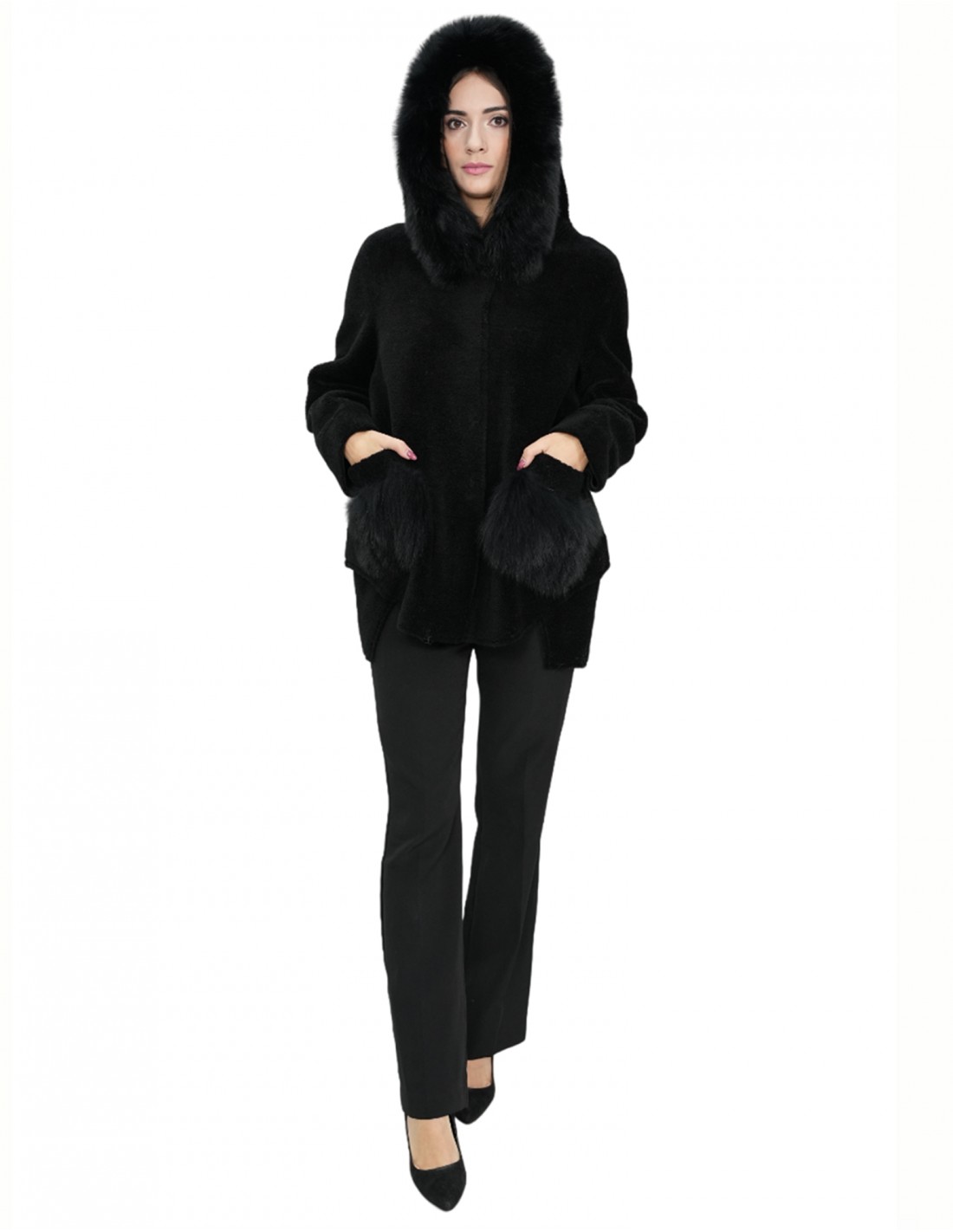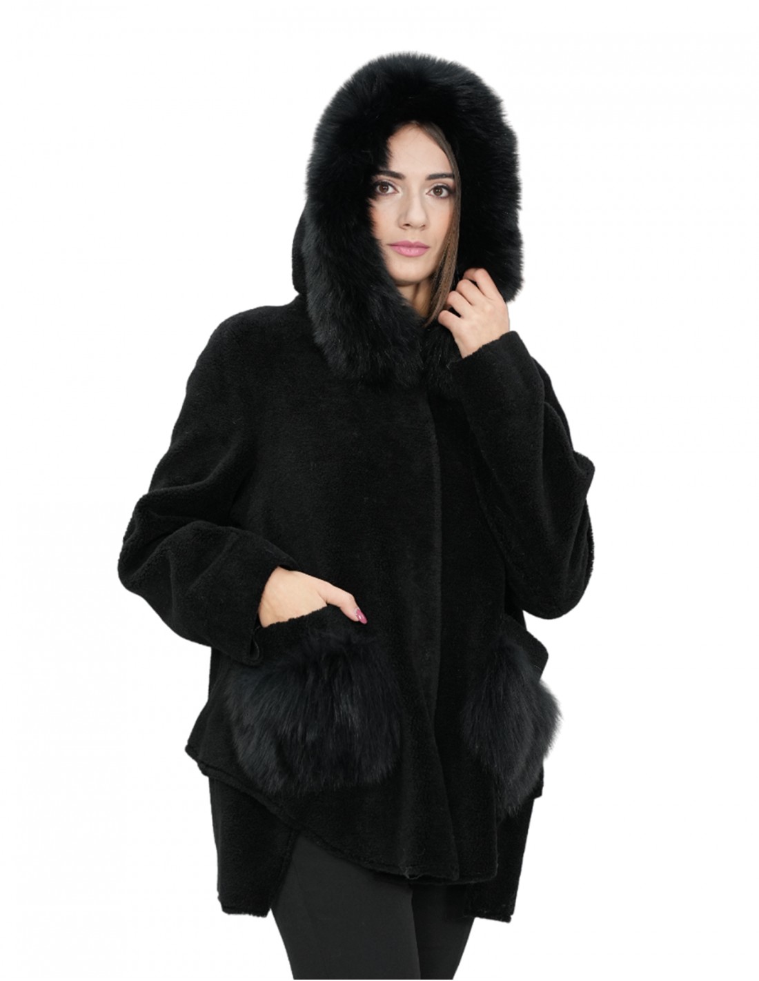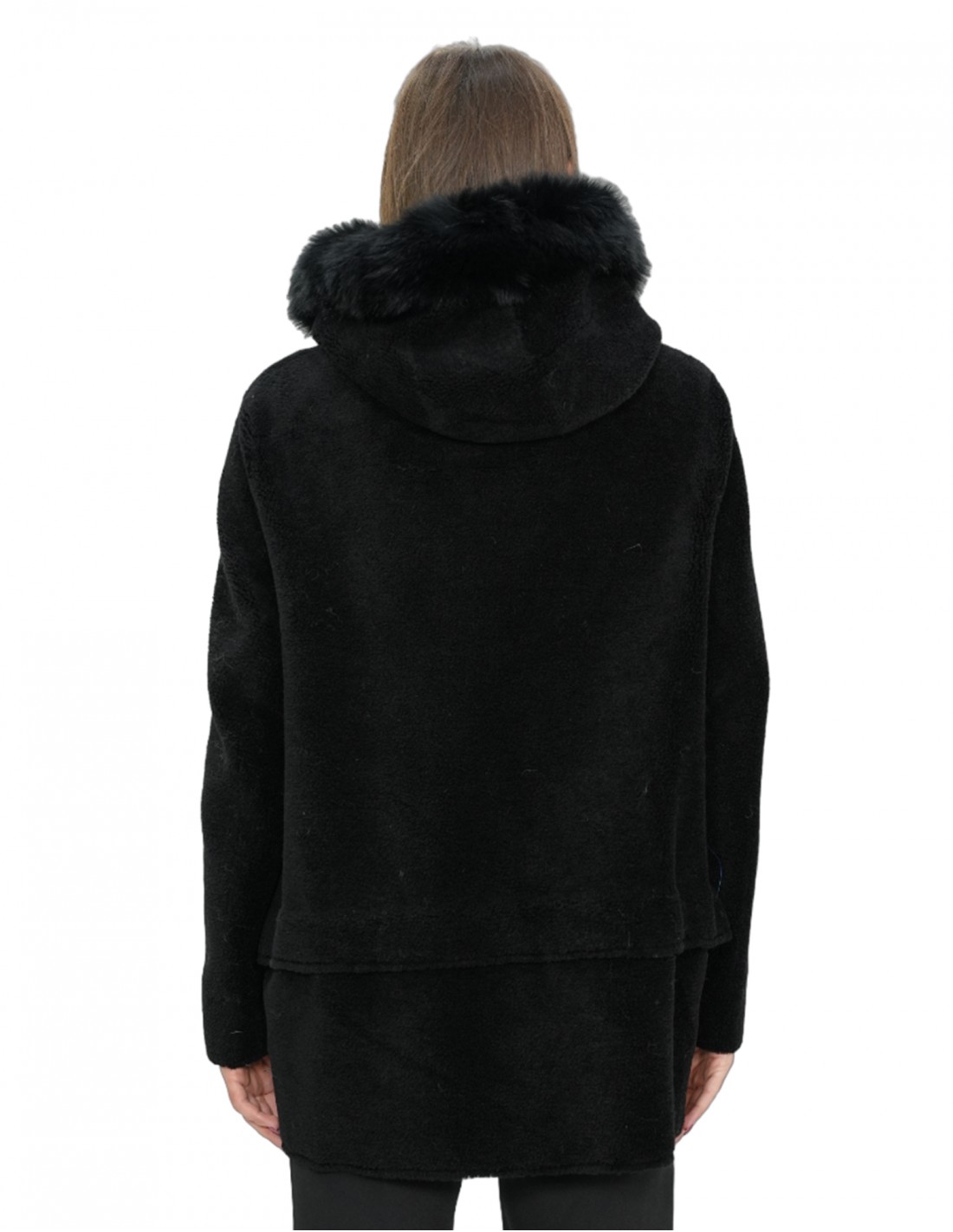 Jackenmantel mit Schaffell, 76 Zentimeter lang, mit Kapuzenkragen, Reißverschluss, Außentaschen, alles in Schwarz.