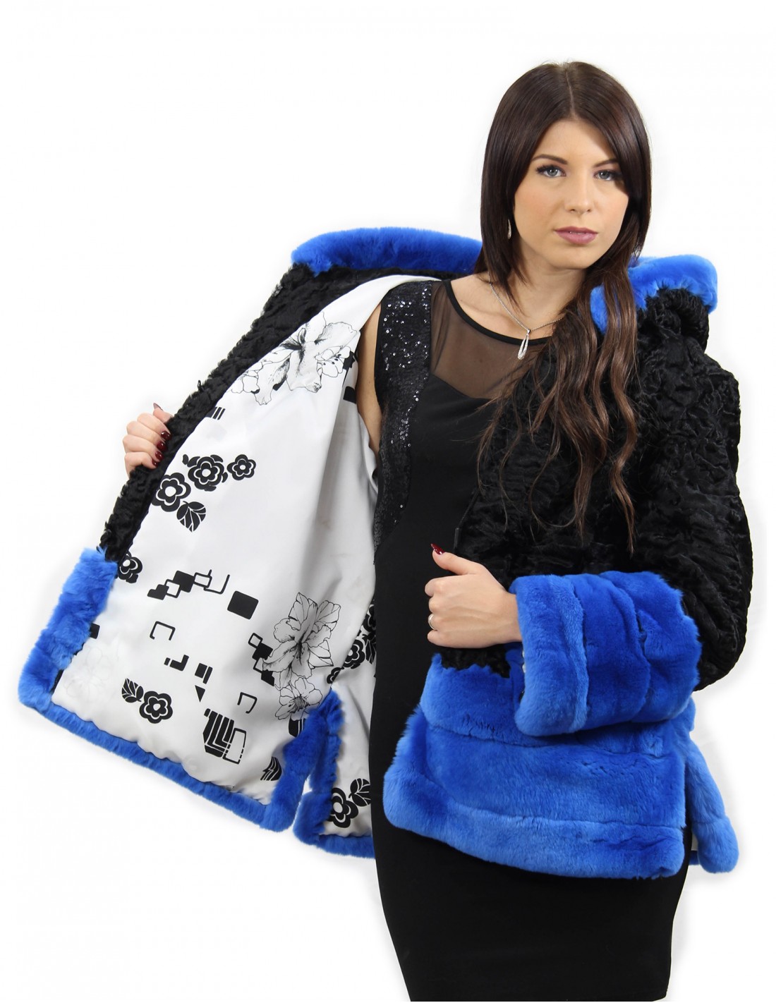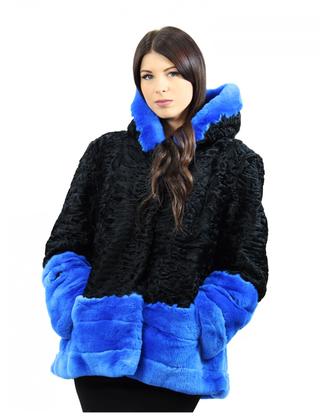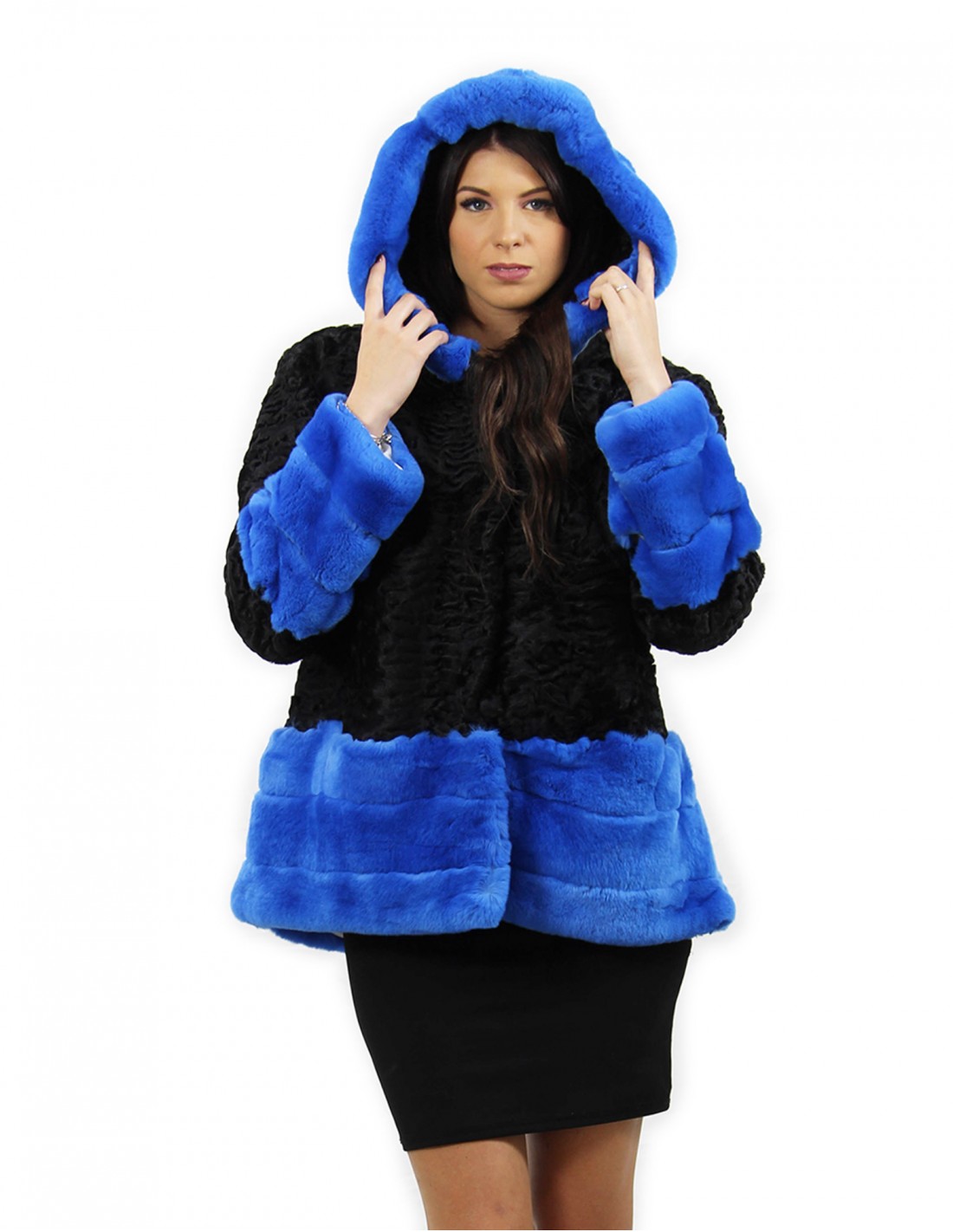 Home » Shop » Schwarze und persische blaue Pelzjacke und Rex Größe 54 mit langärmelige Kapuze elegantes Modell