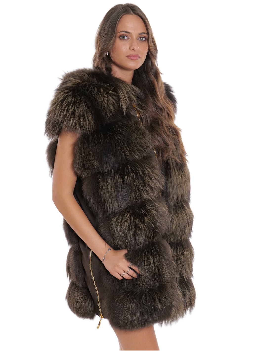 Gilet volpe con cappuccio 60 pelliccia con pelle marrone scamosciata zip oro second life