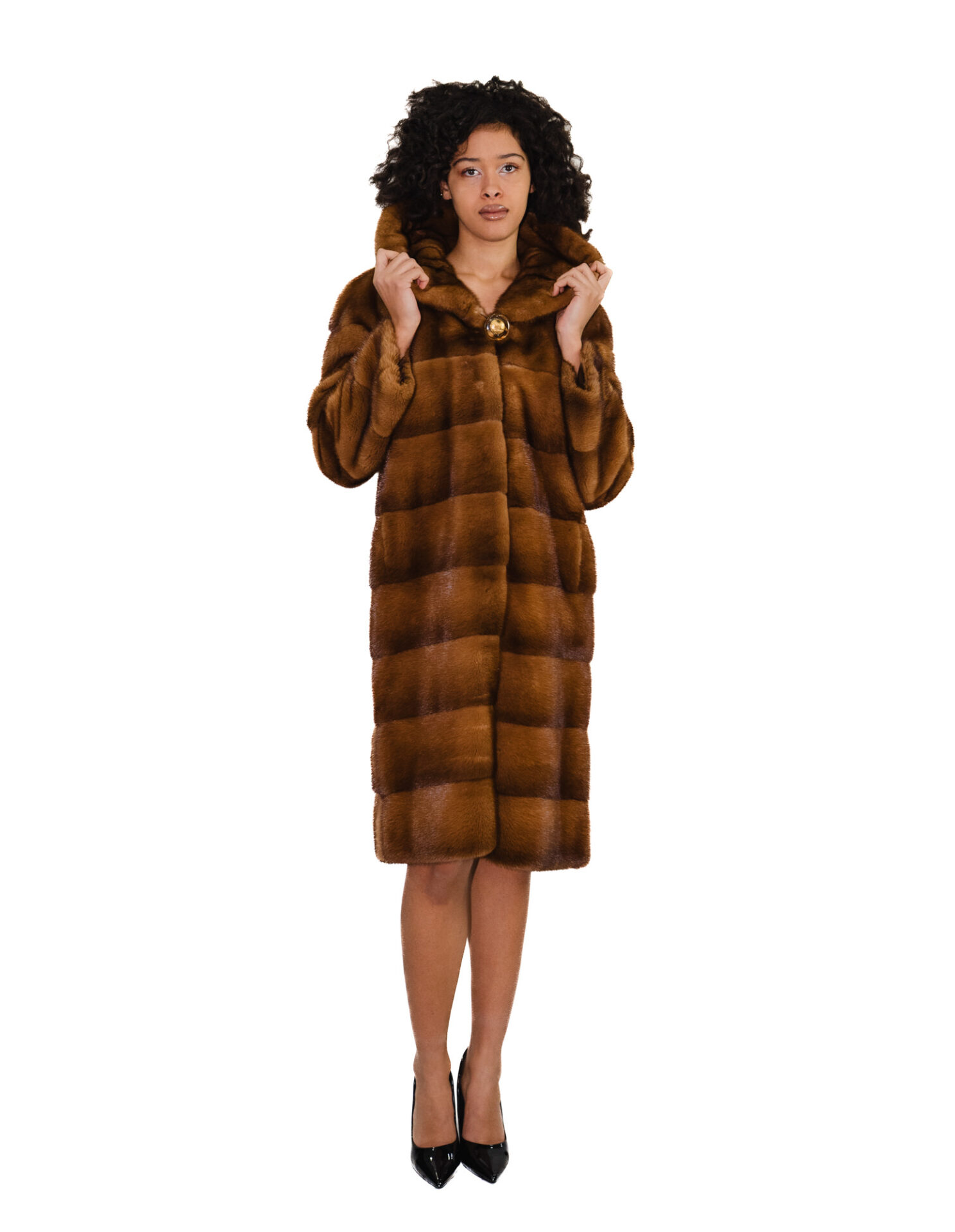 Horizontal geschnittene Nerzjacke mit Kapuze, Größe 46, hellbraun, lange Ärmel, Knopf am Hals, Kordelzug in der Taille