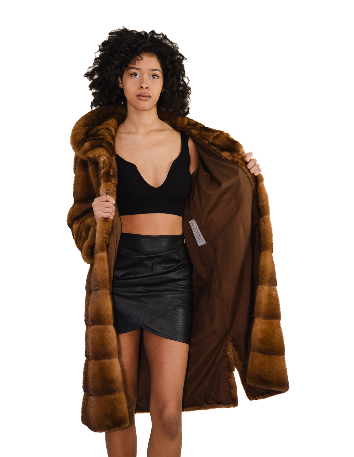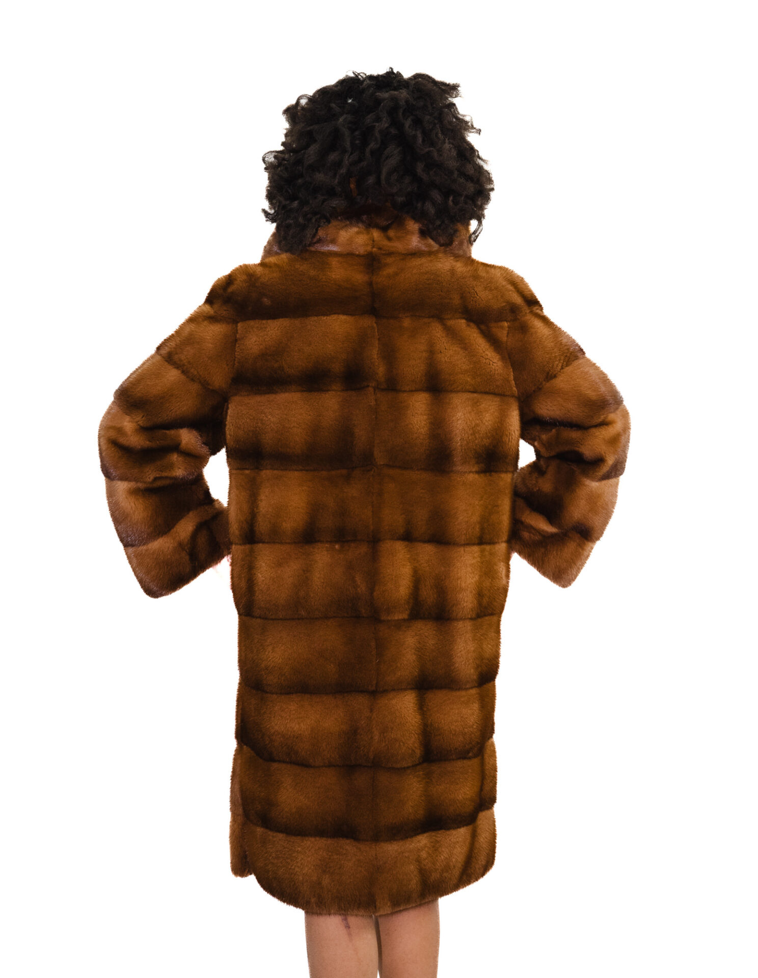 Home » Shop » 50 Goldblonder langer Mantel, 110 Nerzpelz, horizontaler Kragen mit Knopf und langen Ärmeln