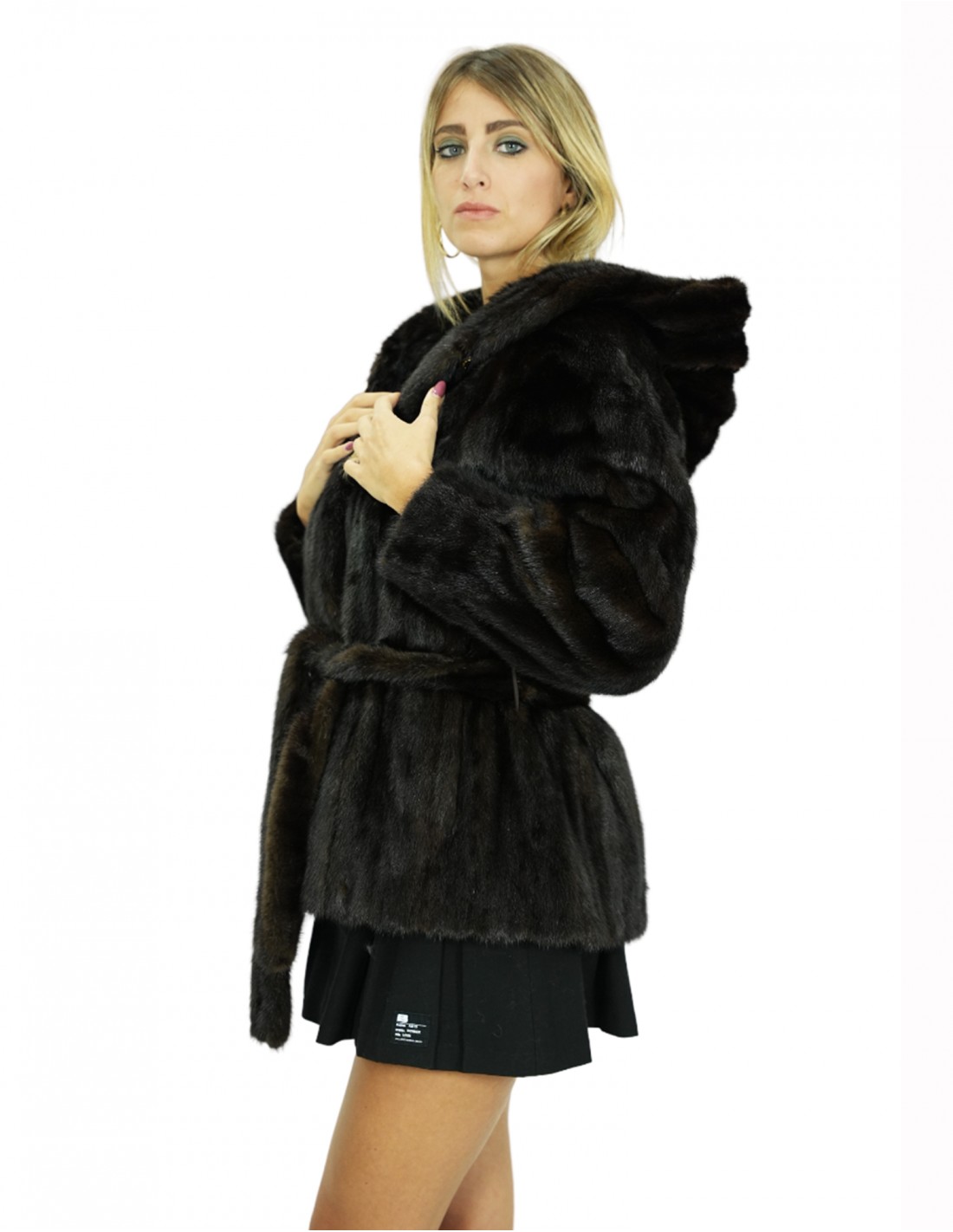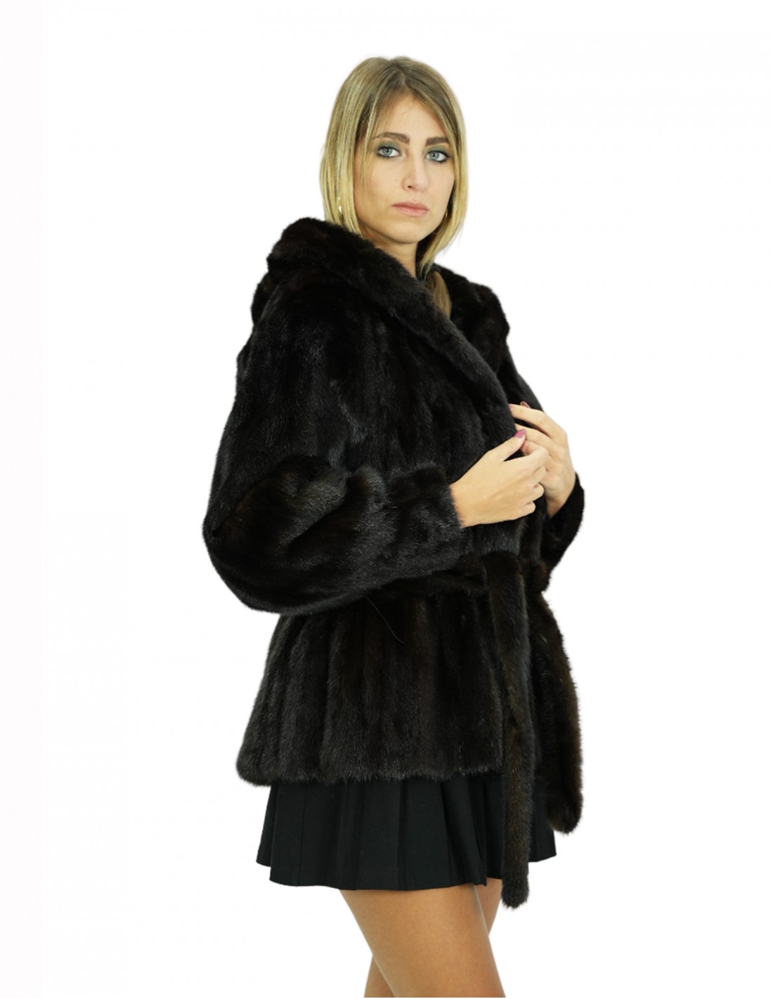 Nerzpelzmantel mit vertikaler Lederverarbeitung, mit Kapuze und Schmuckknopfverschluss