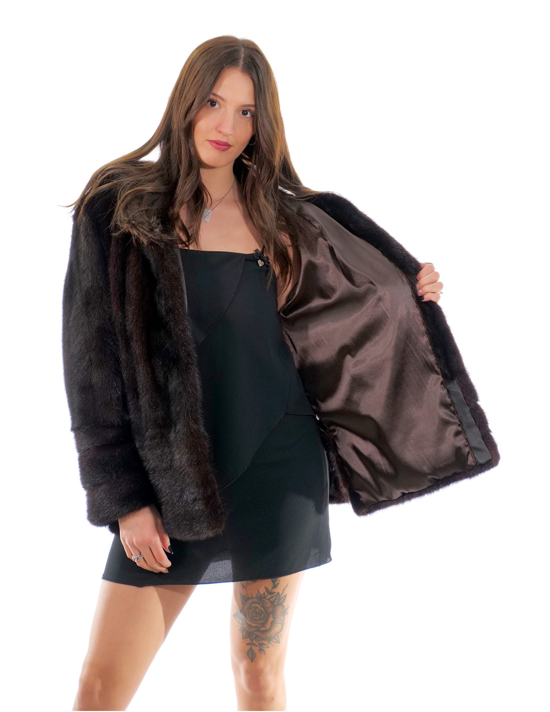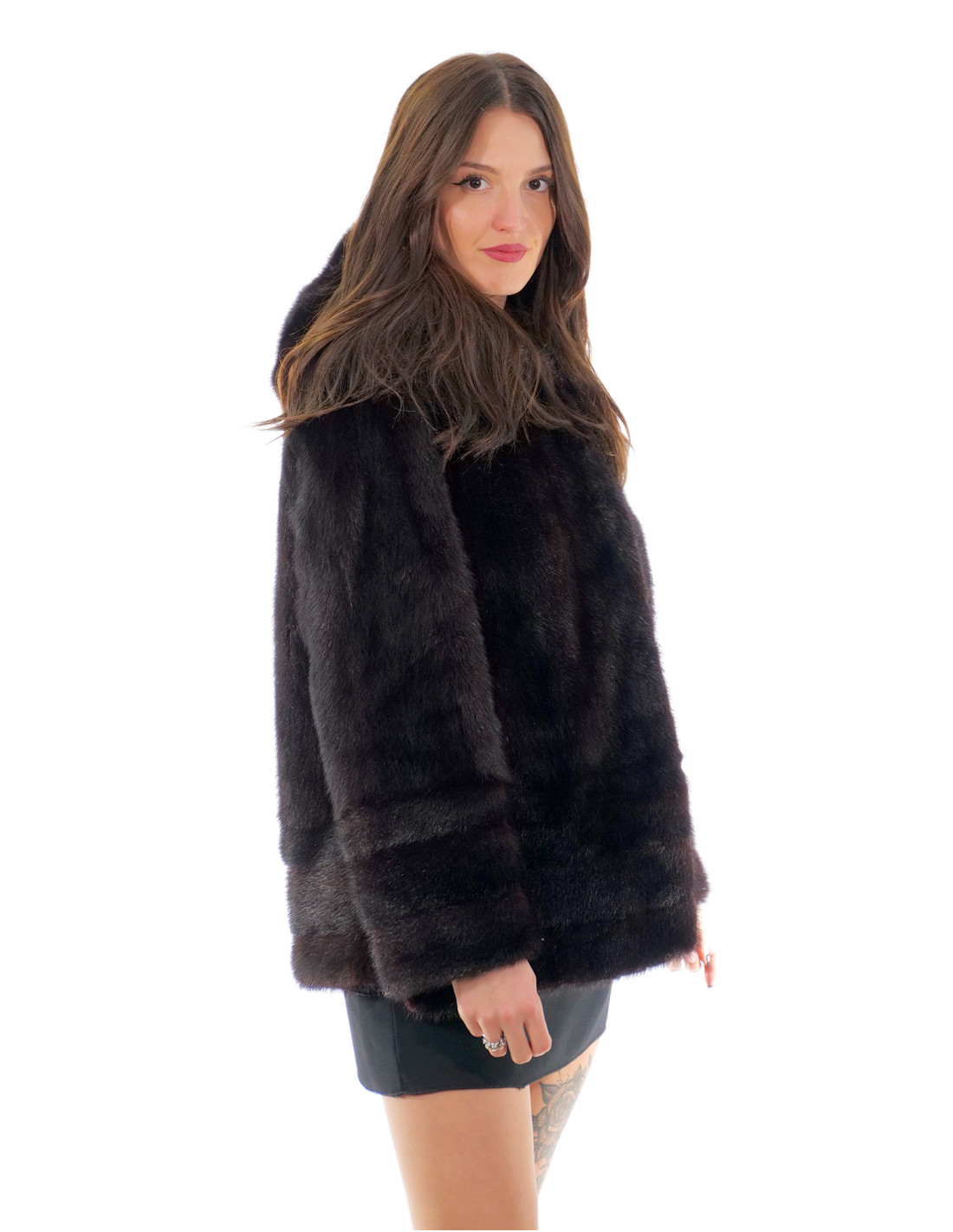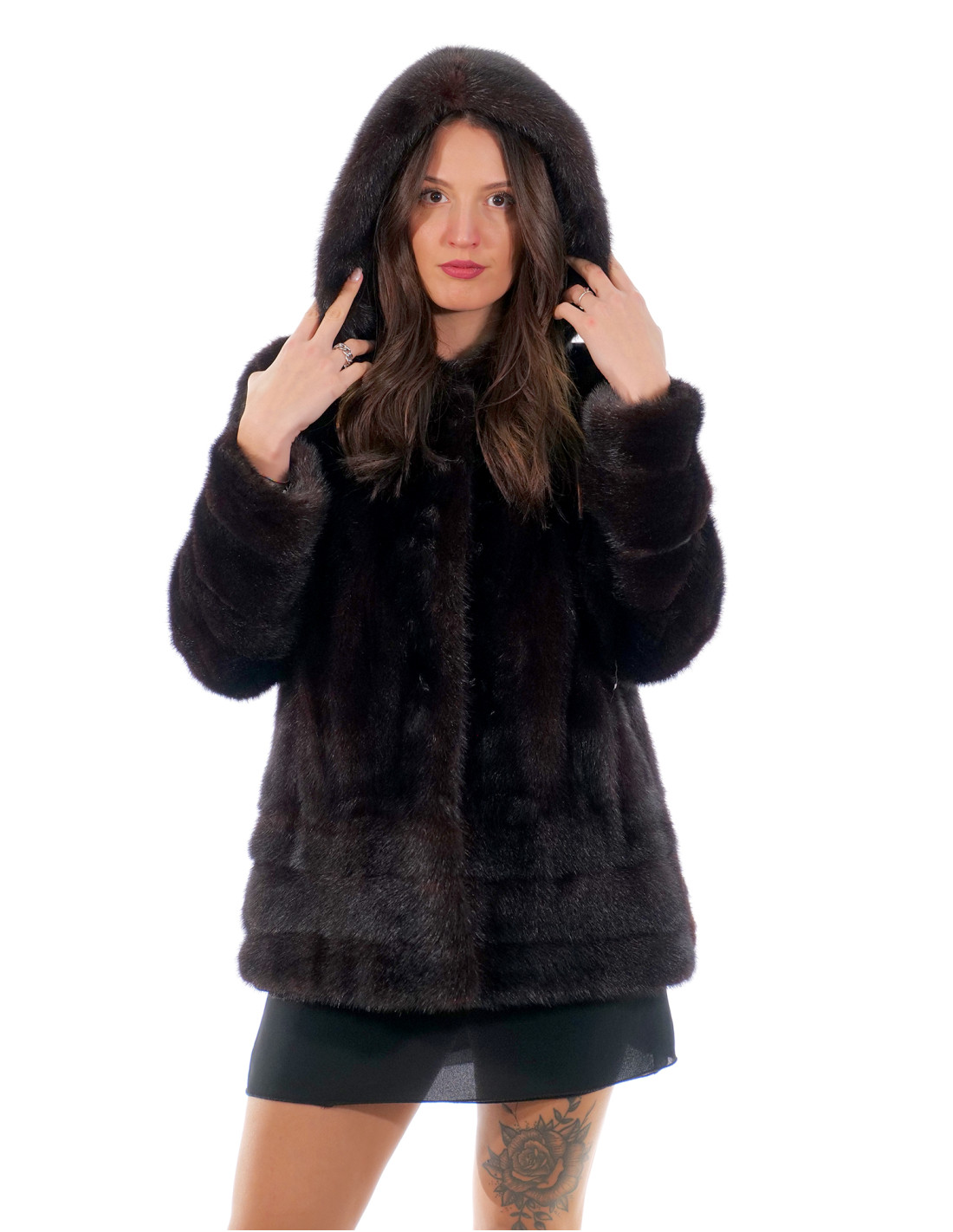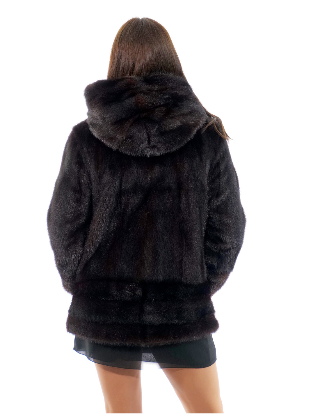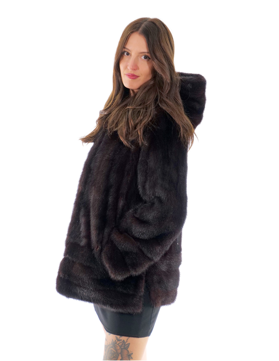50 horizontale und vertikale Mahagoni-Nerzfelle mit Kapuze und Schlitzen an der Unterseite der langen Ärmel