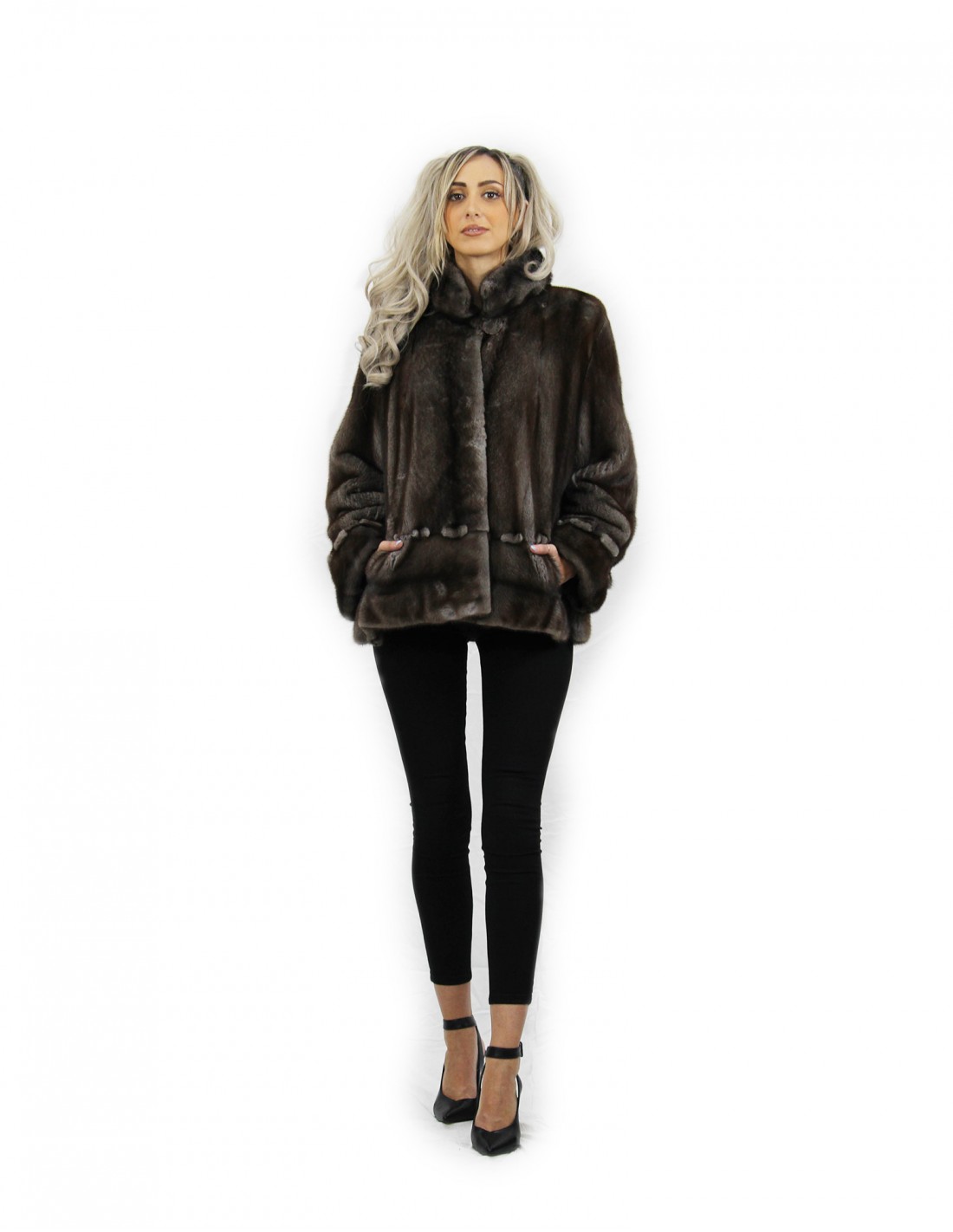 Nerzjacke mit ganzen Fellen. Unsere Nerzfelle werden in unseren Werkstätten hergestellt, daher eine einzigartige und exklusive Nerzjacke. Die Möglichkeit, unsere Pelze von höchster Qualität herzustellen, ermöglicht es uns, Vorschläge zu verschiedenen Preisen mit verschiedenen Anlässen zu immer günstigen Preisen zu machen. Darüber hinaus garantieren unsere Labore und unsere Kooperationen ein Nerzfell von unbestrittener Qualität, das zu 100% in Italien hergestellt wird. Die dafür verwendete Qualität des weiblichen Nerzfells ist eine Nerzjacke mit Fellen der Marke Kopenaghen Furs. Die Nerzpelzjacke kommt in Volllederverarbeitung, mit Außentaschen mit Hakenverschluss und koreanischem Kragen mit Zierknopf, lange Ärmel in Blaulichtfarbe.