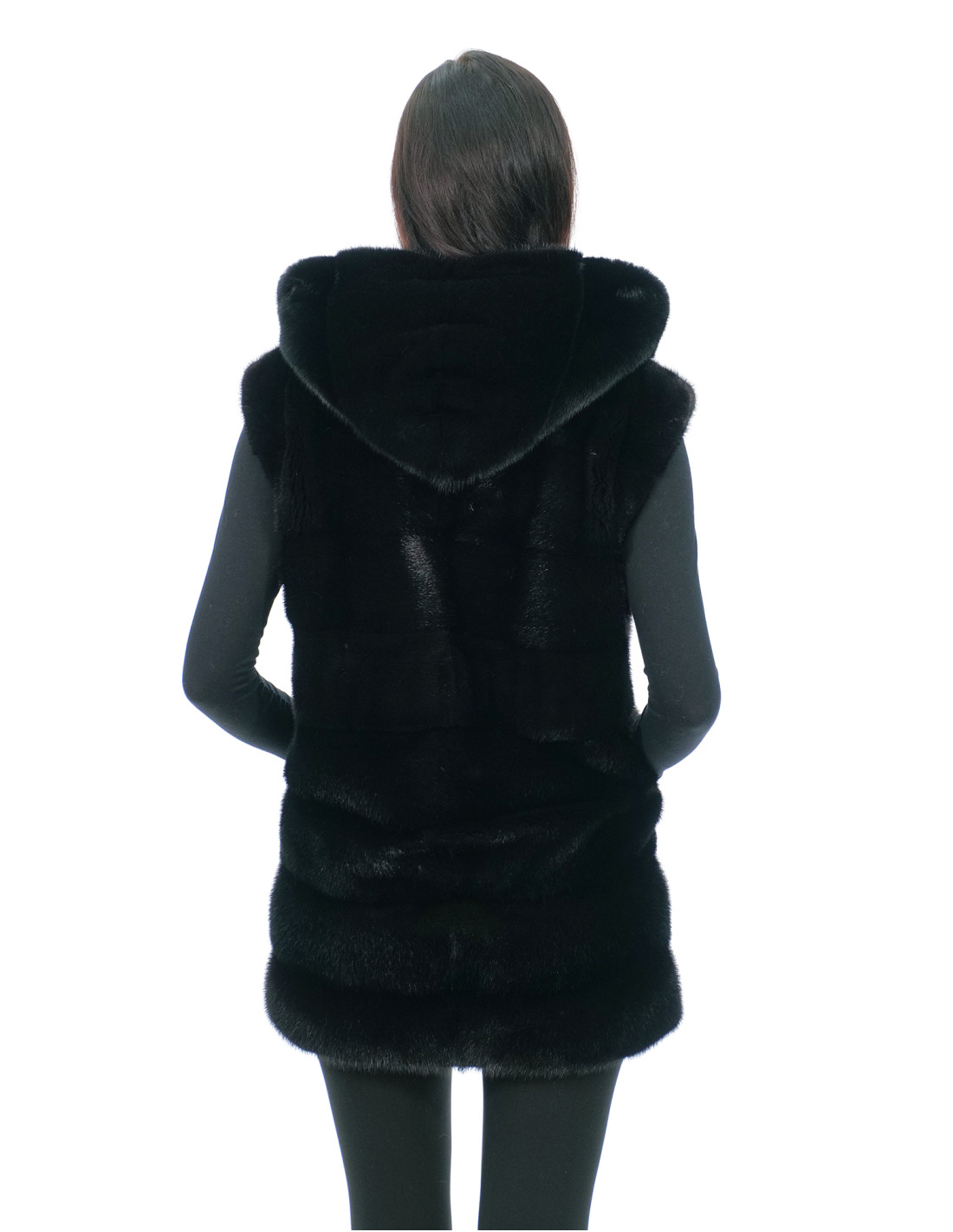 Horizontal verarbeitete Vollhaut-Nerzweste. Unsere Nerzpelze sind Produkte aus unseren Laboren und daher eine einzigartige und exklusive Nerzweste. Die Fähigkeit, unsere Pelze in höchster Qualität herzustellen, ermöglicht es uns, Angebote zu unterschiedlichen Preisen zu unterbreiten, wobei für verschiedene Anlässe stets günstige Preise verfügbar sind. Darüber hinaus garantieren unsere Labore und unsere Zusammenarbeit ein Nerzfell von unbestrittener Qualität, 100 % Made in Italy. Die hierfür verwendete Qualität des weiblichen Nerzfells ist eine Nerzfellweste der Marke Saga Furs. Die Nerzpelzweste präsentiert sich in horizontaler Verarbeitung, mit schöner Kapuze mit Nerzfell außen und innen, Hakenverschluss und normalen Außentaschen, alles in Schwarz.