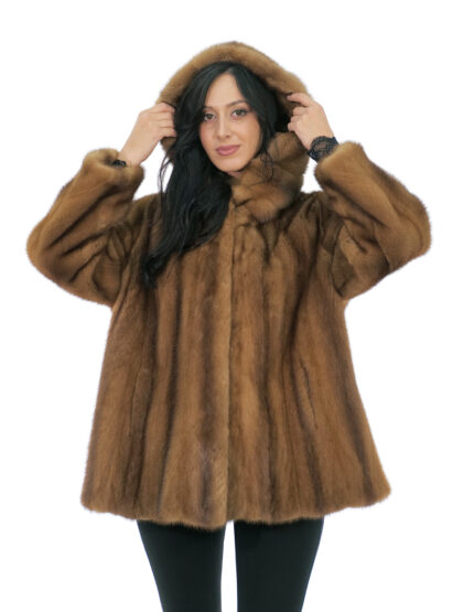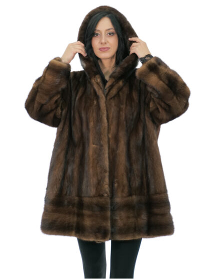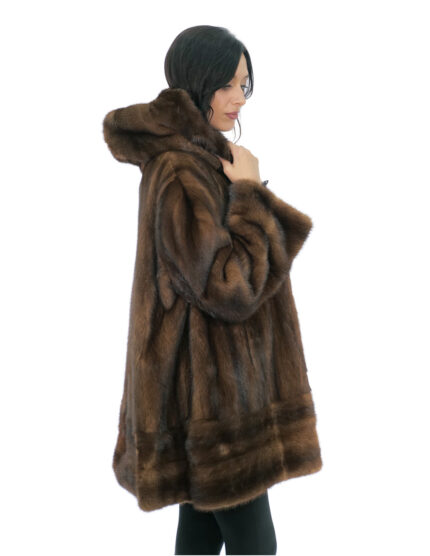 Vertical model mahogany mink fur jacket 56 with horizontal bands on cuffs and hood bottom