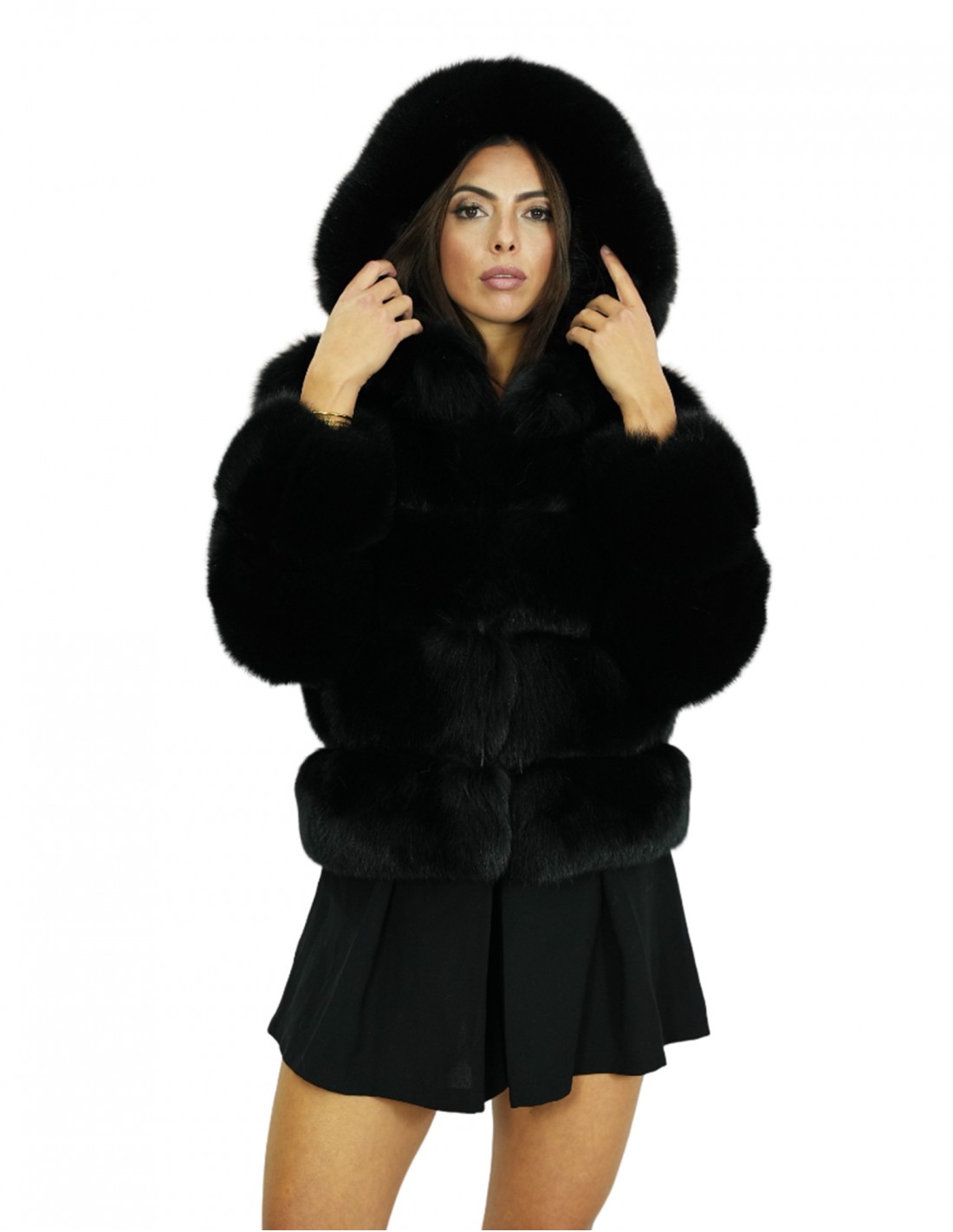 Full skin fox fur jacket in horizontal processing with black fox leather lined hood. Our fox furs are productions made in our laboratories, therefore a unique and exclusive fox jacket. The possibility of producing our furs of the highest quality allows us to make proposals at different prices with various opportunities at low prices always available. Furthermore, our laboratories and our collaborations guarantee fox fur of undisputed quality, 100% made in Italy. The quality of fox fur used for this is a fox fur jacket with Saga furs signature skins. The fox fur jacket features horizontal processing, external pockets, internal hook closure, long sleeves and fox fur-lined hood, with horizontal processing, all in black.
