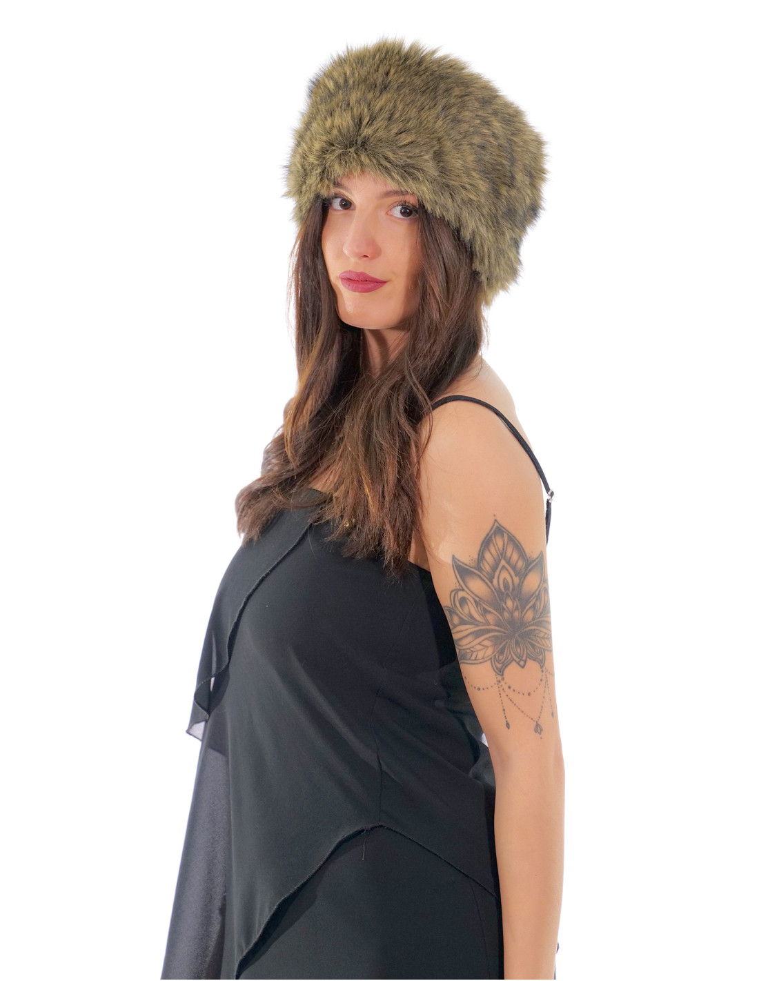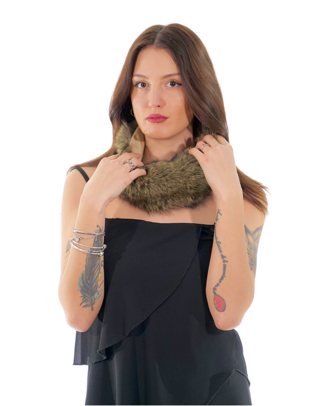 Eco fox fur headband with elastic for soft dressing, soft beige velvet lining, beige shaded brown fur to be used both as earmuffs and as a neck warmer.