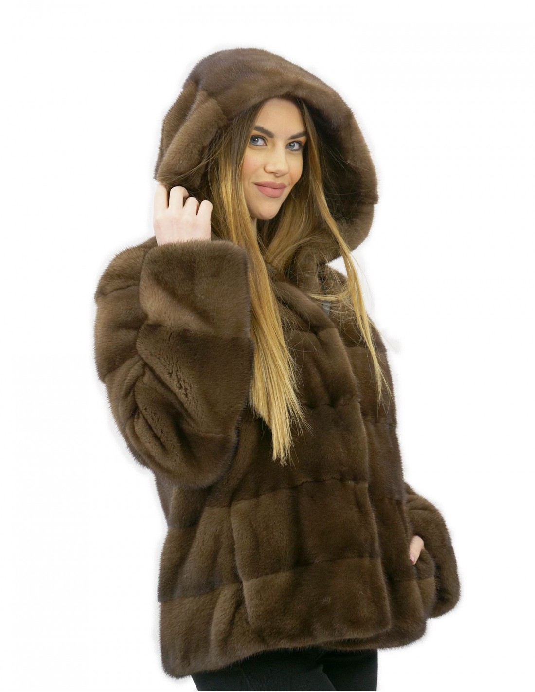 Mink jacket with whole skins in horizontal processing. Our mink furs are productions made in our workshops, therefore a unique and exclusive mink jacket. The possibility of producing our furs of the highest quality allows us to make proposals at different prices with various occasions at low prices always available. Furthermore, our laboratories and our collaborations guarantee a mink fur of undisputed quality 100% made in Italy. The quality of female mink fur used for this is a mink fur jacket with saga furs branded skins. The mink fur jacket comes in a gorgeous brown color with a beautiful hood completely lined with whole mink skins also inside, long sleeves and normal outside pockets.