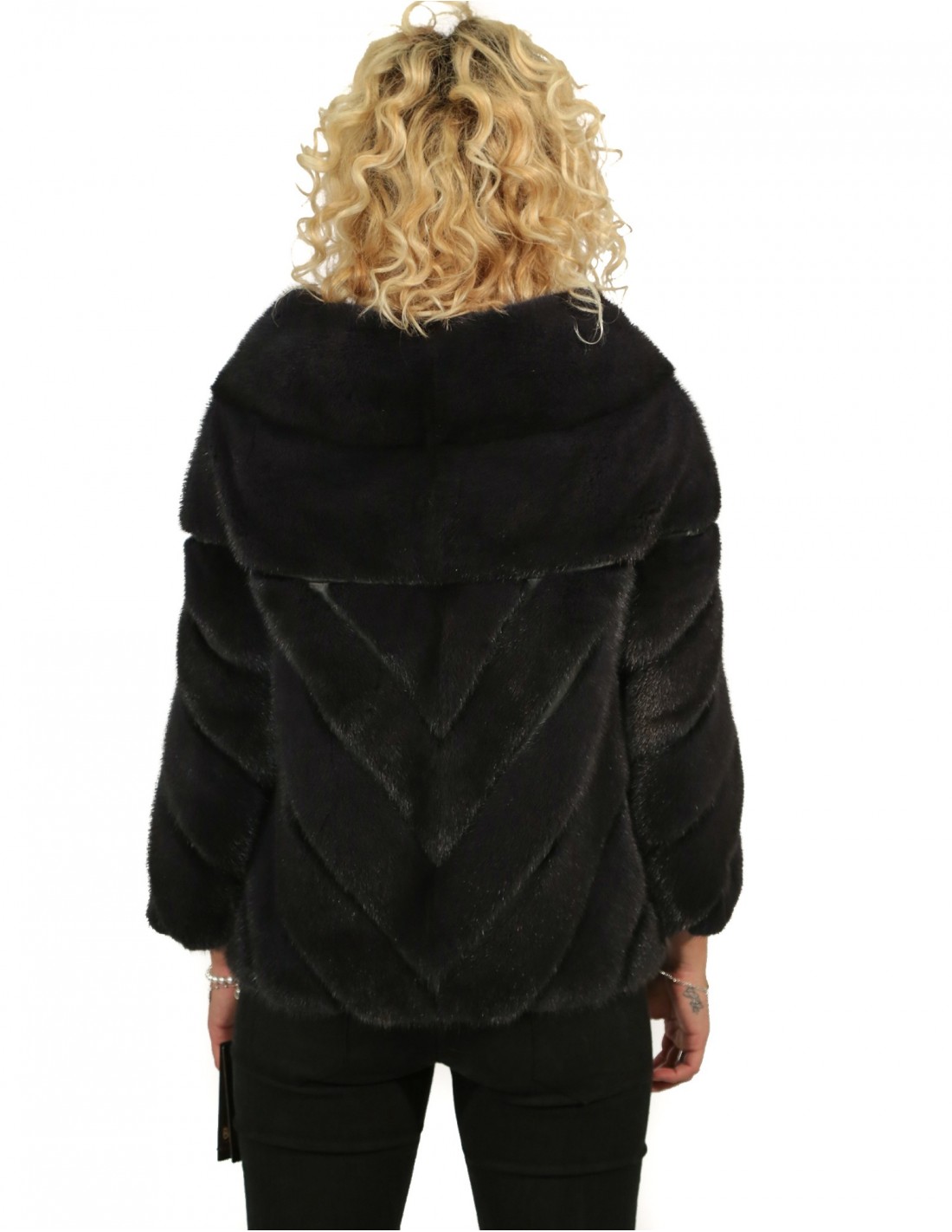 44 mink dark denim jacket with transverse machining with leather inserts piping neck