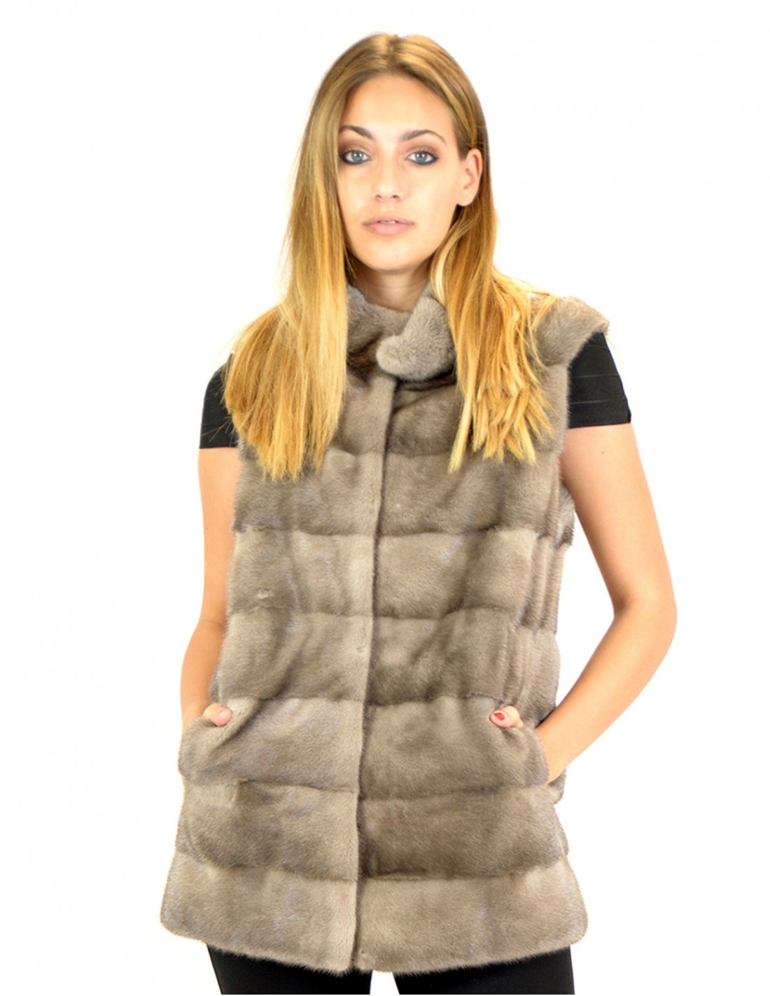 waistcoat mink fur skins whole in horizontal machining. Our mink furs are productions of our laboratories, therefore unique and exclusive. The ability to produce our high quality fur selecting only female mink pelts from exclusive breeding allows us to make proposals at different prices with different occasions at low prices always available. In addition, our laboratories and our collaborations provide a mink coat of exceptional quality 100% made in Italy. The quality of female mink coat used for this is a mink fur coat with fur inmoda initialed skins. The mink fur vest looks silverblue color and high collar.