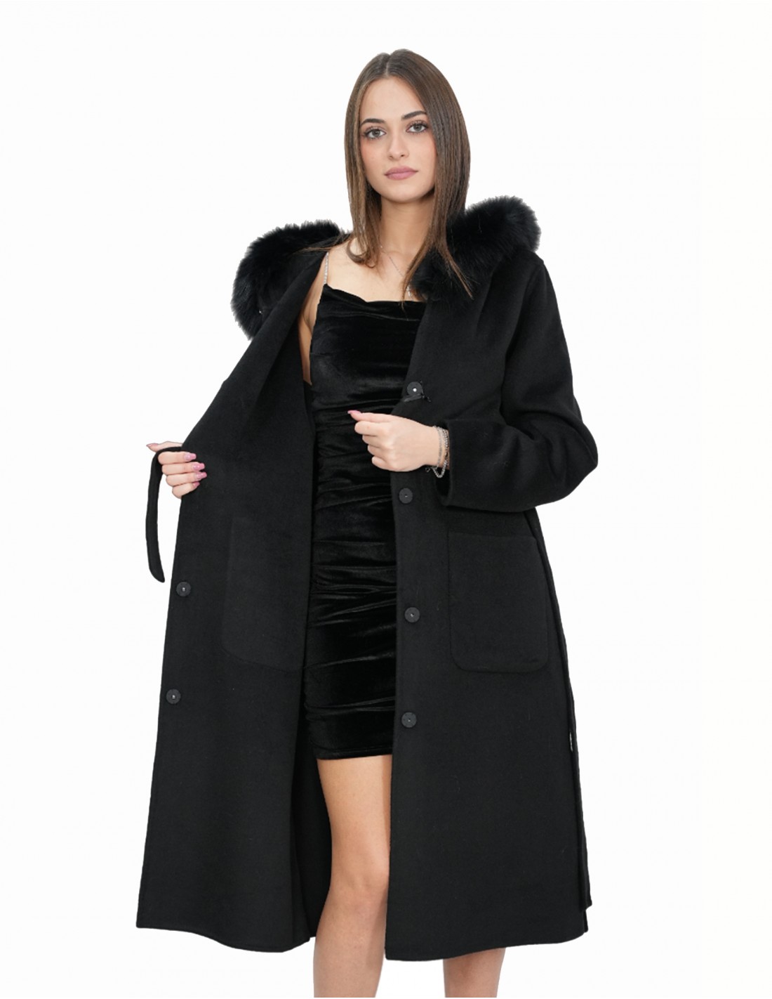 Black 50 coat in wool and fox fur cashmere with hood belt and button closure