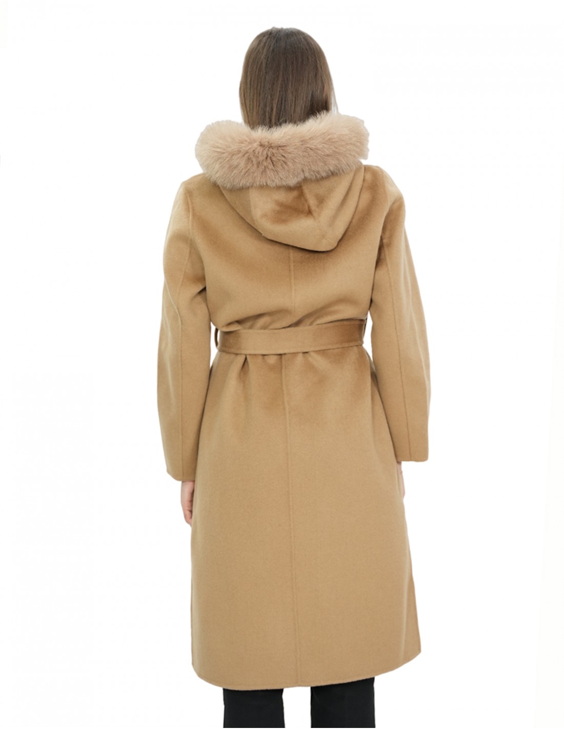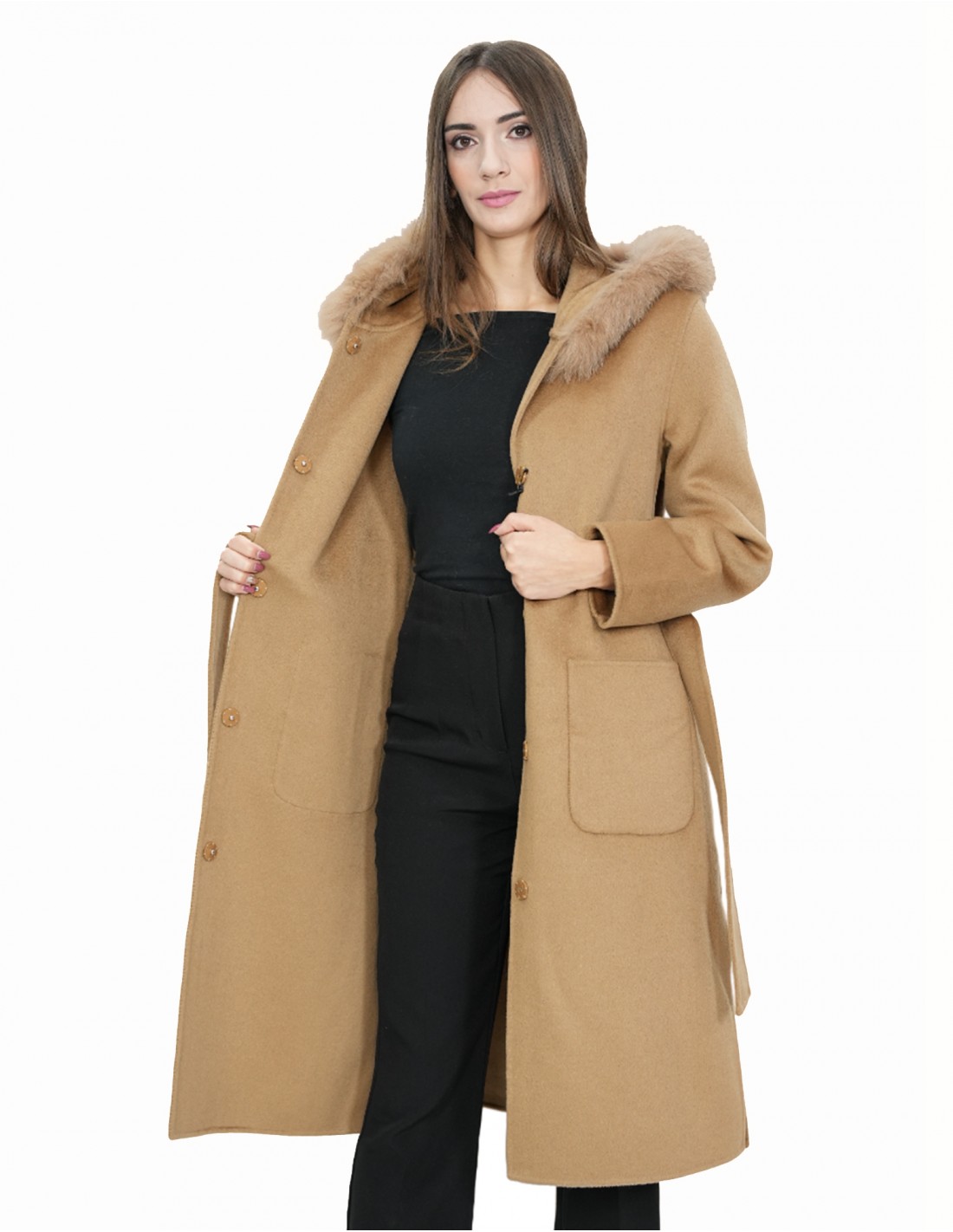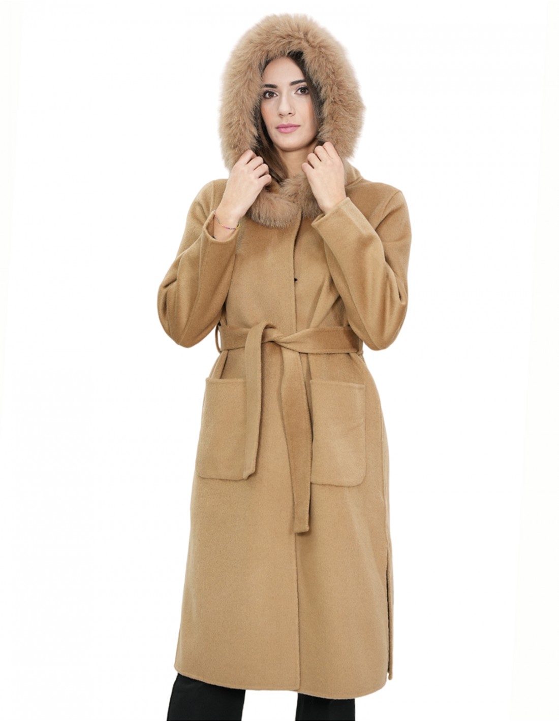 Cashmere coat with detachable fox fur. Our cashmere furs are productions made in our laboratories, therefore a unique and exclusive cashmere coat. The possibility of producing our furs of the highest quality allows us to make proposals at different prices with various opportunities at low prices always available. Furthermore, our laboratories and our collaborations guarantee fur of undisputed quality, 100% made in Italy. The quality of cashmere wool fur used for this is a jacket with leathers signed InModa Pellicceria. The cashmere coat is long above the knee, with external mug pockets, cashmere belt and cashmere hood with detachable fox fur trim, long sleeves and in camel colour.