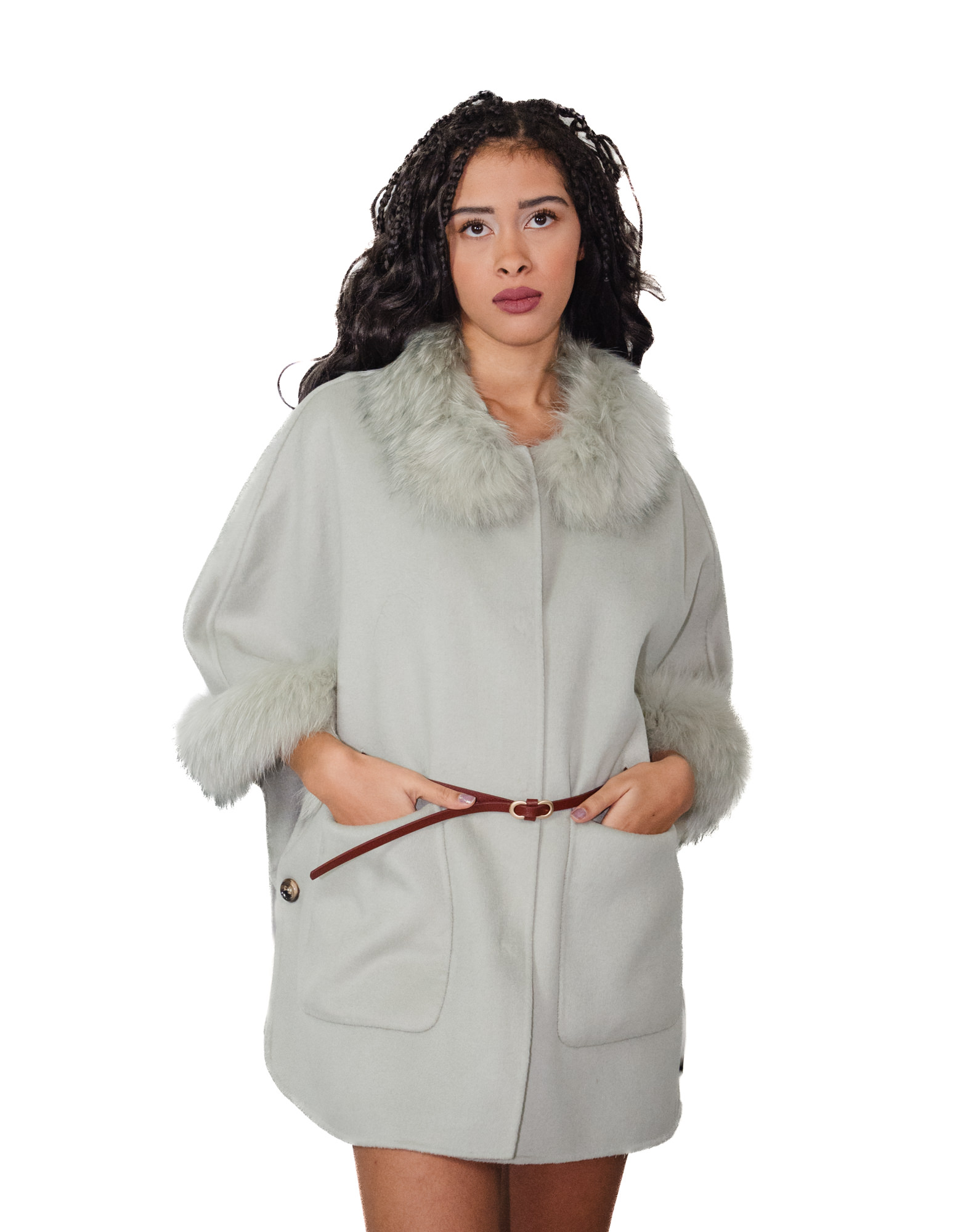 Light green cashmere and wool blend cape, open on the side with a small drawstring and two button closure, three-quarter sleeves, slanted pockets, internal leather strap, decorative faux fur on the cuffs and collar, unlined and with clip button closure.